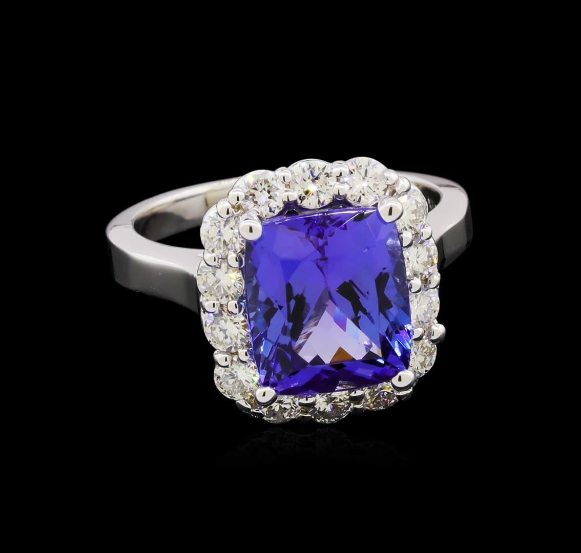 One electronically tested 14KT white gold lady's cast fashion ring with a basket halo with a bright polish finish. The featured lady's ring has a shank measuring 2.26 millimeters wide. Identified with markings of "14K". Condition is new, good workmanship. Containing: One prong set rectangular cushion modified brilliant cut natural tanzanite, measuring 10.15 x 8.80 x 6.38mm, approximate weight of 4.71ct., clarity is eye clean, type I, medium dark, moderately strong, violetish blue color, (GIA vB 6/4), cut is very good. Transmitting light with no distortion, transparent. Colored gemstones are presumed to have been subjected to commonly used enhancement processes. Graded in the setting. Fourteen prong set round brilliant cut diamonds, measuring 2.60 - 2.50 x 1.58mm (depth est.) approximate total weight of 14 Stones = 0.88ct. Graded in the setting. Clarity: SI-1 to SI-2. Color: H - I. Cut Very Good. Total Weight of Colored Stones 4.71ct. Total Weight of Diamonds 0.88ct. Total Weight of Ring 6.30gm. GAS Appraised at $11,110.00.