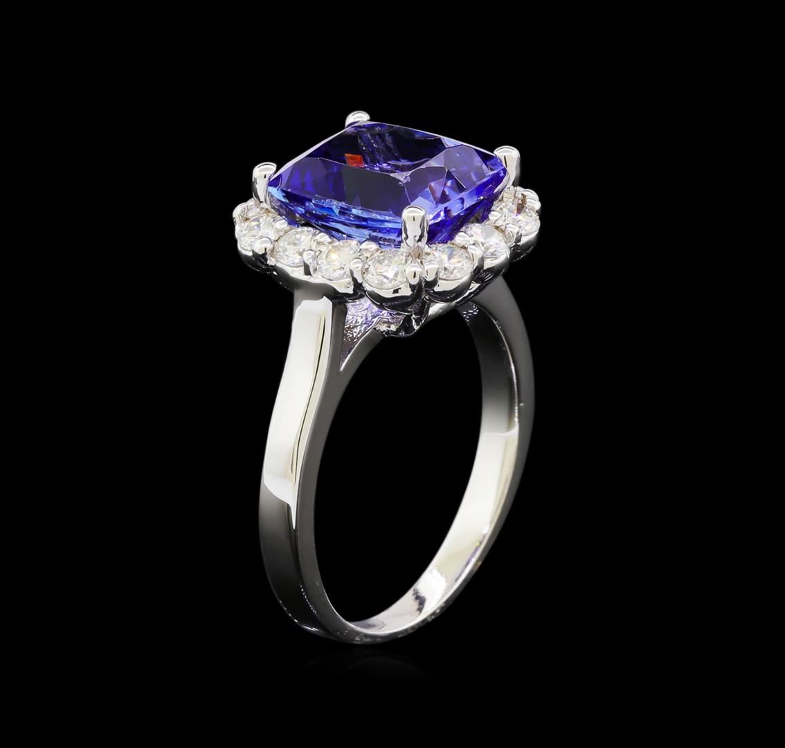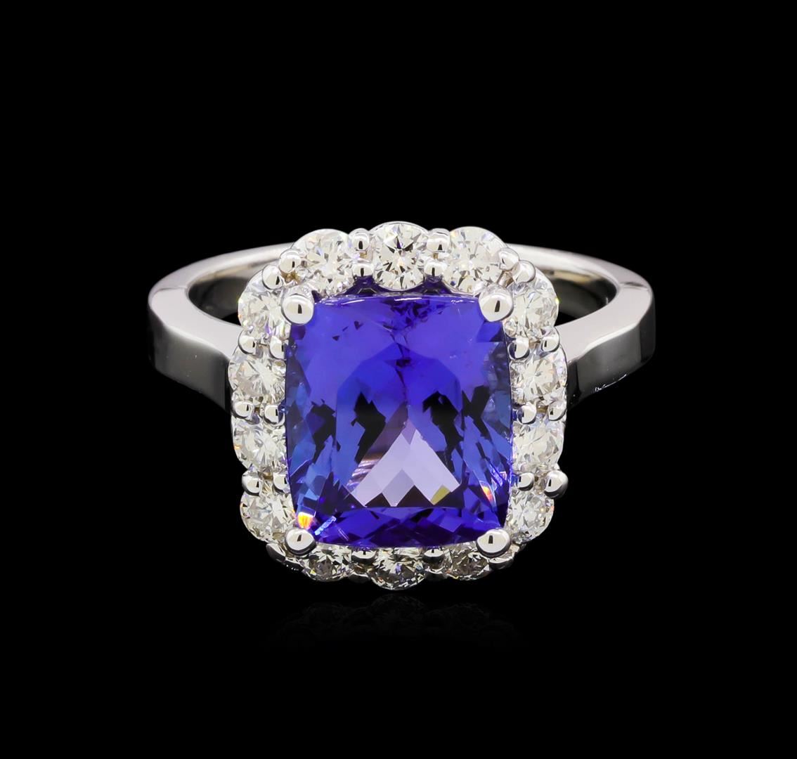 One electronically tested 14KT white gold lady's cast fashion ring with a basket halo with a bright polish finish. The featured lady's ring has a shank measuring 2.26 millimeters wide. Identified with markings of "14K". Condition is new, good workmanship. Containing: One prong set rectangular cushion modified brilliant cut natural tanzanite, measuring 10.15 x 8.80 x 6.38mm, approximate weight of 4.71ct., clarity is eye clean, type I, medium dark, moderately strong, violetish blue color, (GIA vB 6/4), cut is very good. Transmitting light with no distortion, transparent. Colored gemstones are presumed to have been subjected to commonly used enhancement processes. Graded in the setting. Fourteen prong set round brilliant cut diamonds, measuring 2.60 - 2.50 x 1.58mm (depth est.) approximate total weight of 14 Stones = 0.88ct. Graded in the setting. Clarity: SI-1 to SI-2. Color: H - I. Cut Very Good. Total Weight of Colored Stones 4.71ct. Total Weight of Diamonds 0.88ct. Total Weight of Ring 6.30gm. GAS Appraised at $11,110.00.