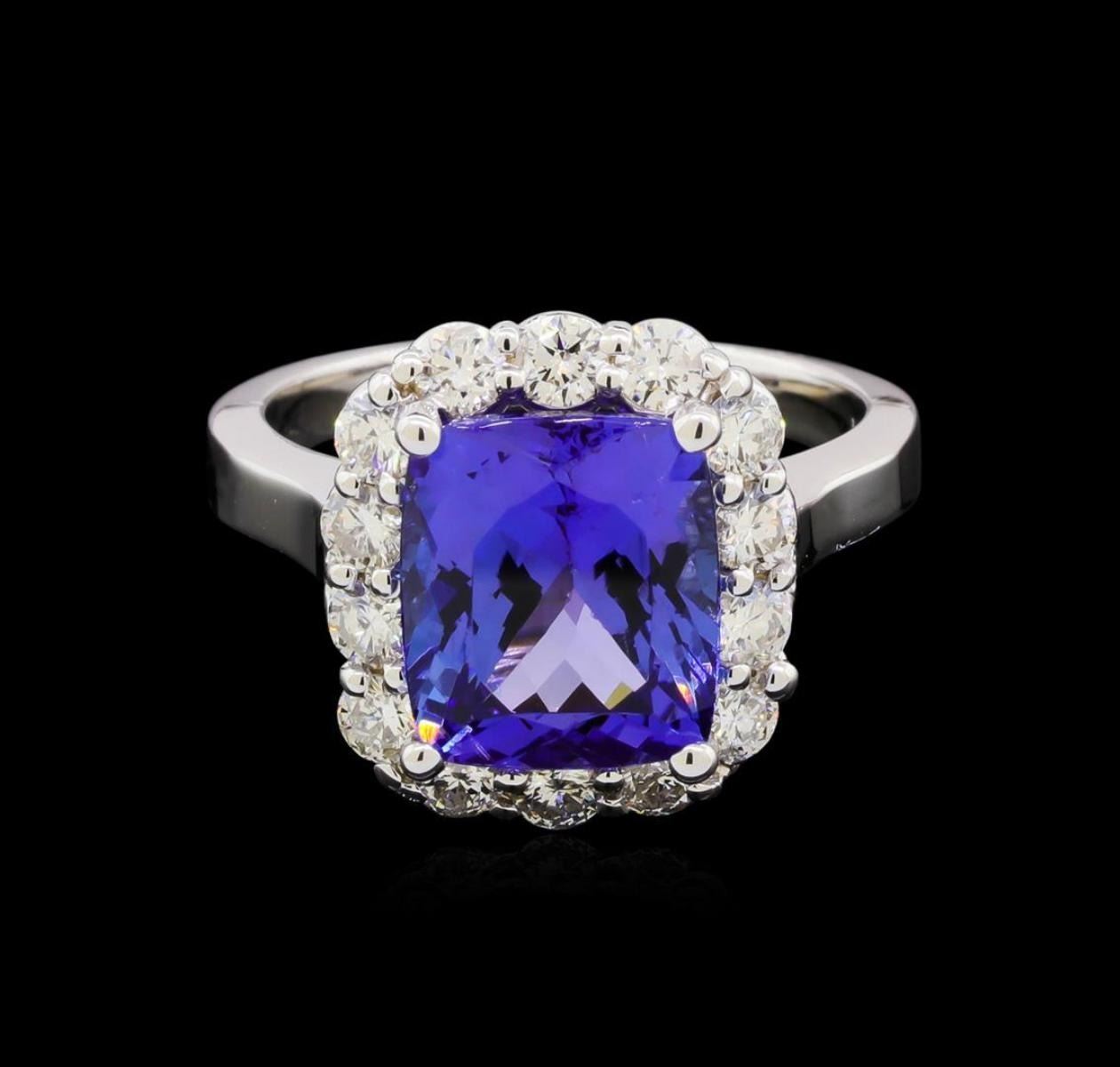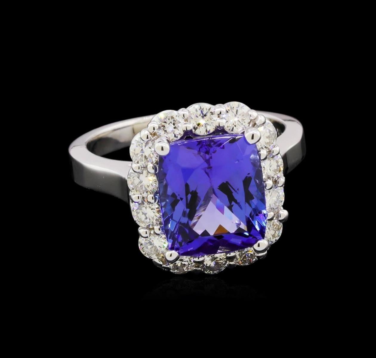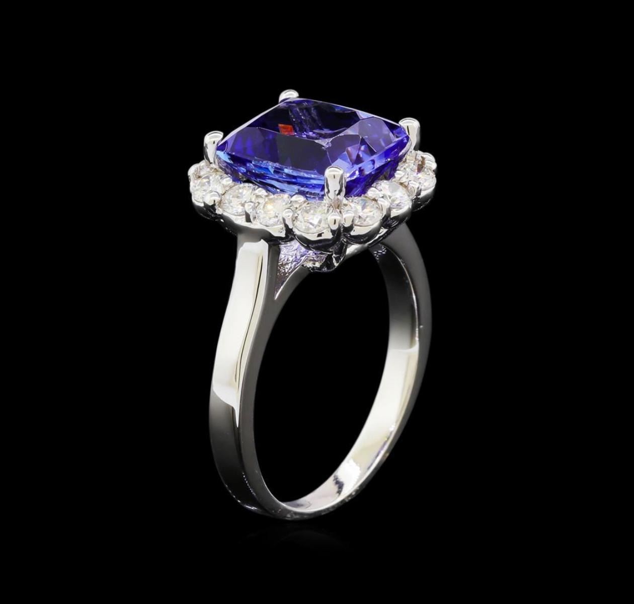 One electronically tested 14KT white gold lady's cast fashion ring with a basket halo with a bright polish finish. The featured lady's ring has a shank measuring 2.26 millimeters wide. Identified with markings of "14K". Condition is new, good workmanship. Containing: One prong set rectangular cushion modified brilliant cut natural tanzanite, measuring 10.15 x 8.80 x 6.38mm, approximate weight of 4.71ct., clarity is eye clean, type I, medium dark, moderately strong, violetish blue color, (GIA vB 6/4), cut is very good. Transmitting light with no distortion, transparent. Colored gemstones are presumed to have been subjected to commonly used enhancement processes. Graded in the setting. Fourteen prong set round brilliant cut diamonds, measuring 2.60 - 2.50 x 1.58mm (depth est.) approximate total weight of 14 Stones = 0.88ct. Graded in the setting. Clarity: SI-1 to SI-2. Color: H - I. Cut Very Good. Total Weight of Colored Stones 4.71ct. Total Weight of Diamonds 0.88ct. Total Weight of Ring 6.30gm. GAS Appraised.