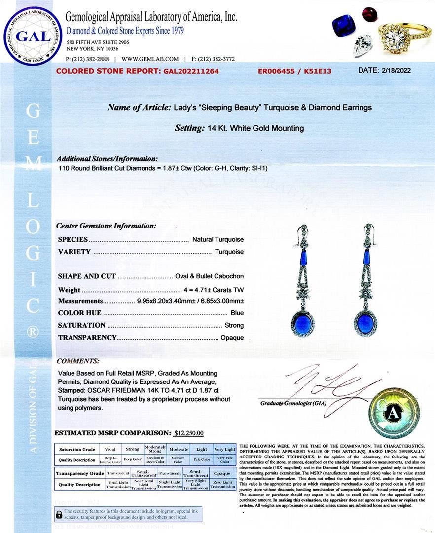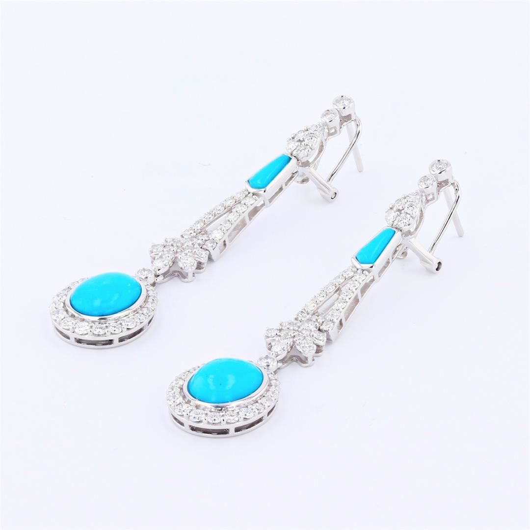 4.71ctw Turquoise and 1.87ctw Diamond 14K White Gold Earrings. Please see Photos and Description for all available information. This pair of earrings features a stunning 4.71ctw of natural turquoise and 1.87ctw of round brilliant diamonds. It is handcrafted in 14K white gold and is perfect for everyday wear.