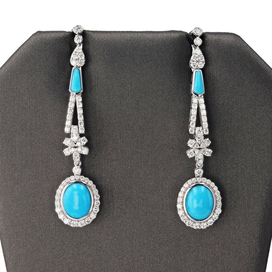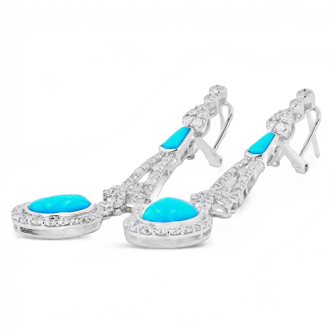 4.71ctw Turquoise and 1.87ctw Diamond 14K White Gold Earrings. Please see Photos and Description for all available information. This pair of earrings features a stunning 4.71ctw of natural turquoise and 1.87ctw of round brilliant diamonds. It is handcrafted in 14K white gold and is perfect for everyday wear.