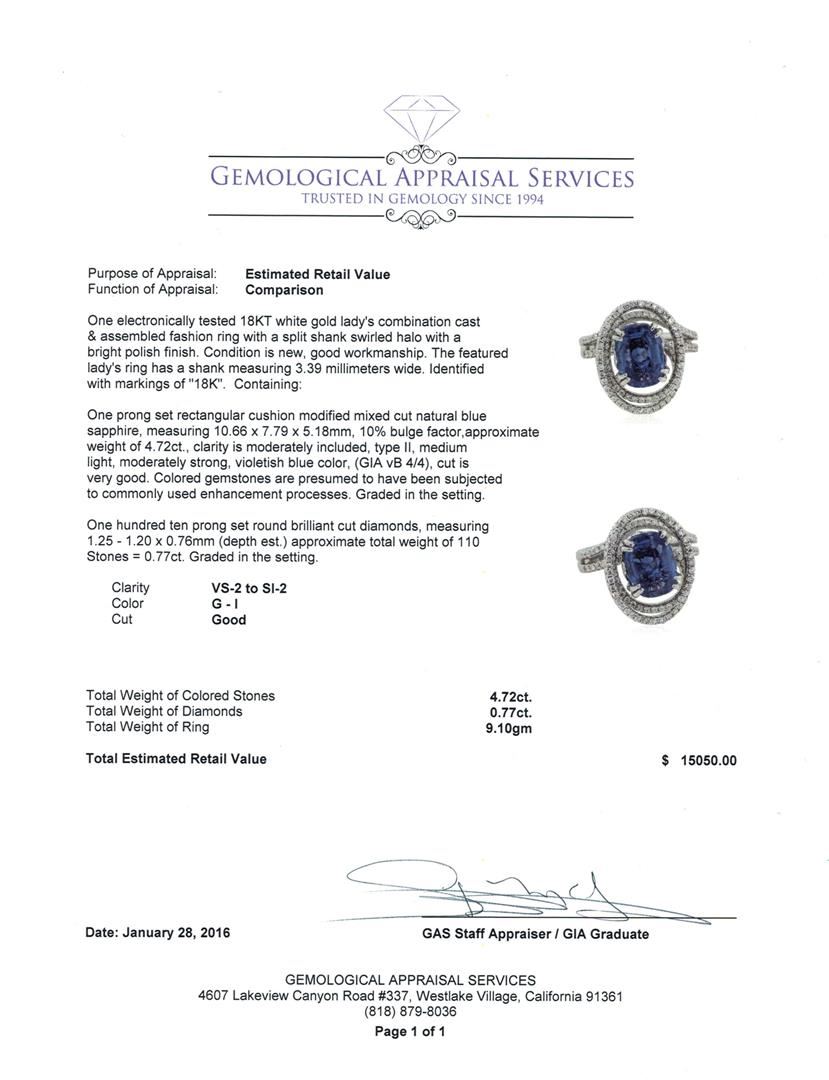 One electronically tested 18KT white gold lady's combination cast & assembled fashion ring with a split shank swirled halo with a bright polish finish. The featured lady's ring has a shank measuring 3.39 millimeters wide. Identified with markings of "18K". Condition is new, good workmanship. Containing: One prong set rectangular cushion modified mixed cut natural blue sapphire, measuring 10.66 x 7.79 x 5.18mm, 10%. bulge factor, approximate weight of 4.72ct., clarity is moderately included, type II, medium light, moderately strong, violetish blue color, (GIA vB 4/4), cut is very good. Colored gemstones are presumed to have been subjected to commonly used enhancement processes. Graded in the setting. One Hundred Ten prong set round brilliant cut diamonds, measuring 1.25 - 1.20 x 0.76mm (depth est.) approximate total weight of 110 Stones = 0.77ct. Graded in the setting. Clarity: VS-2 to SI-2. Color: G - I. Cut Good. Total Weight of Colored Stones 4.72ct. Total Weight of Diamonds 0.77ct. Total Weight of Ring 9.10gm. GAS Appraised at $15,050.00.