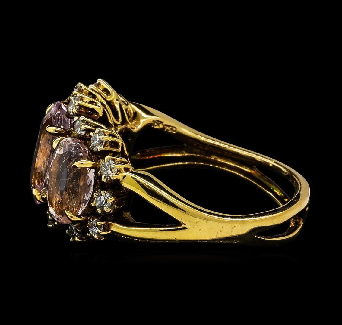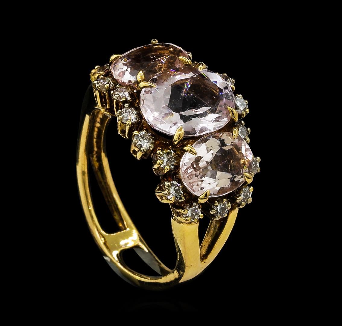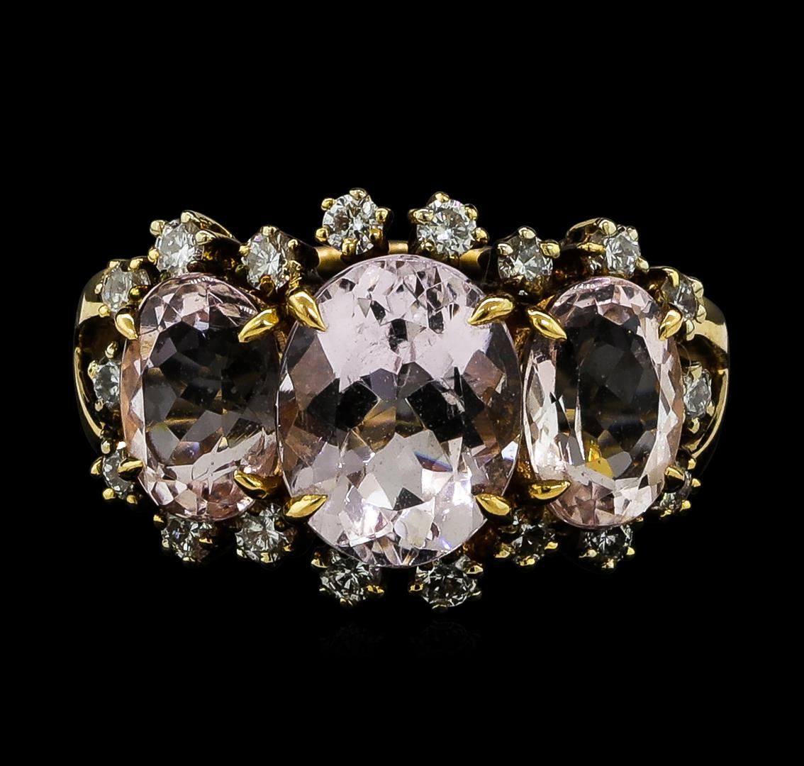 One electronically tested 18KT rose gold ladies cast morganite and diamond ring. The ring features a series of three morganites set within a diamond bezel supported by split shoulders, completed by a four millimeter wide band. Bright polish finish. Identified with markings of '18K 750'. Condition is good. Containing: Three prong set oval mixed cut natural morganites approximate total weight of 4.72ct., clarity is eye clean, light, very slightly grayish, pink color, (GIA Pk 3/3), cut is good. Transmitting light with no distortion, transparent. Color grade is an average for the group. Graded in the setting. Eighteen prong set round brilliant cut diamonds, measuring 2.00 - 2.00 x 1.20mm (depth est.) approximate total weight of 18 Stones = 0.55ct. Graded in the setting. Clarity SI-1 to SI-2. Color: F - H. Total Weight of Colored Stones 4.72ct.. Total Weight of Diamonds 0.55ct.. Total Weight of Ring 7.17gm. AIG Appraised at $5,165.00.