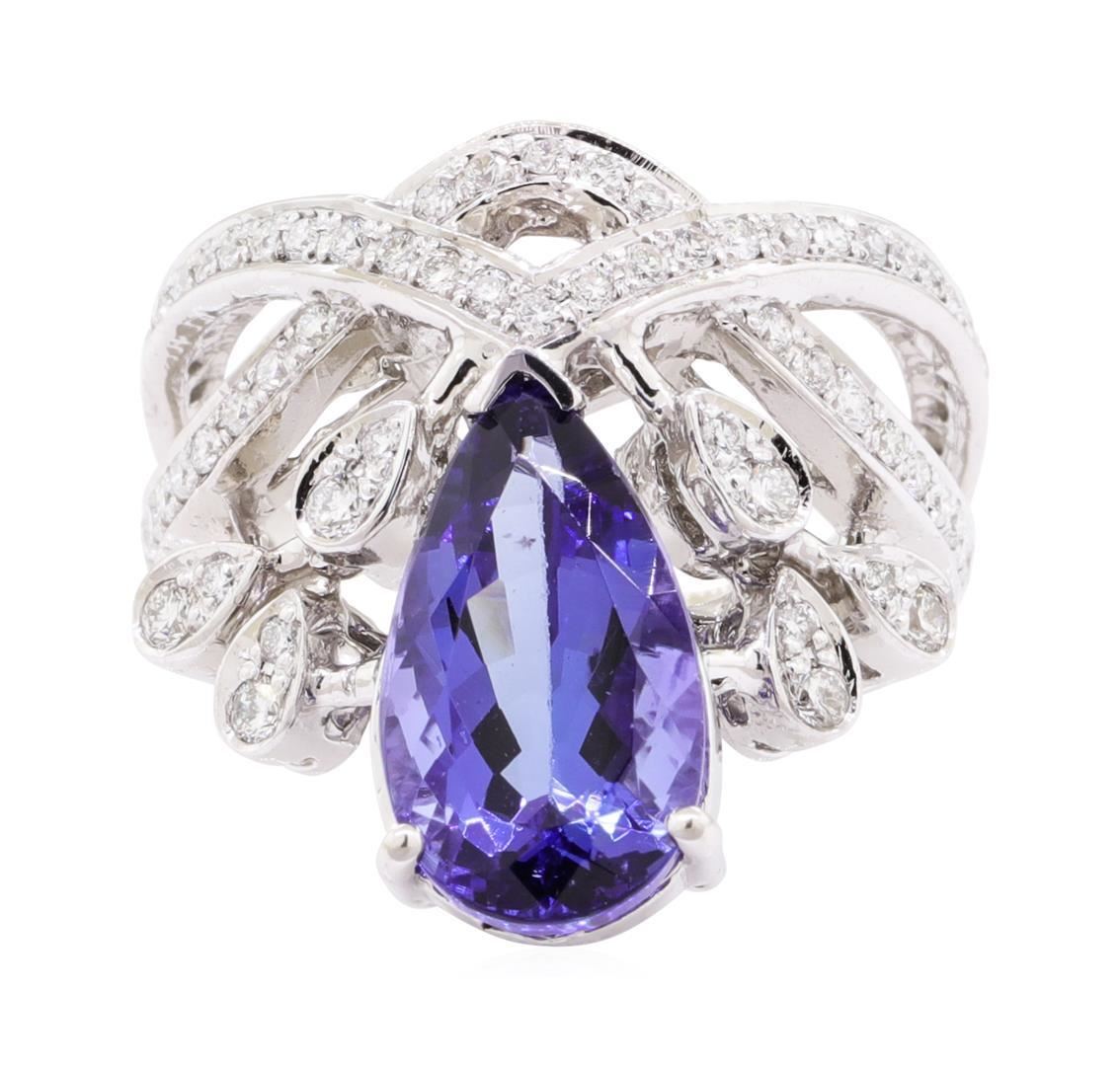 One electronically tested 14KT white gold lady's cast fashion ring with a split shank with a bright polish finish. The featured lady's ring has a tiara motif and a shank measuring 3.00 millimeters wide. Identified with markings of '14K'. Condition is new, good workmanship. Containing: One prong set pear modified mixed cut natural tanzanite, measuring 14.25 x 8.06 x 5.81mm, (depth est.) approximate weight of 4.55ct., clarity is eye clean, medium dark, very slightly grayish, violetish blue color, (GIA vB 6/3), cut is good. Transmitting light with no distortion, transparent. Colored gemstones are presumed to have been subjected to commonly used enhancement processes. Graded in the setting. Six prong set round brilliant cut diamonds, measuring 2.00 - 1.90 x 1.21mm (depth est.) approximate total weight of 6 Stones = 0.17ct. Graded in the setting. Color G - H Clarity SI-1 to SI-2 Cut Very Good Fifty-Nine prong set round brilliant cut diamonds, measuring 1.30 - 1.25 x 0.79mm (depth est.) approximate total weight of 59 Stones = 0.44ct. Graded in the setting. Color G - H Clarity SI-1 to SI-2 Cut Very Good Six prong set round brilliant cut diamonds, measuring 1.20 - 1.15 x 0.73mm (depth est.) approximate total weight of 6 Stones = 0.04ct. Graded in the setting. Color H - I Clarity SI-1 to SI-2 Cut Good. Total Weight of Colored Stones 4.55ct.. Total Weight of Diamonds 0.65ct.. Total Weight of Ring 9.10gm GAS Appraised at $8885.00. GAS Appraised.