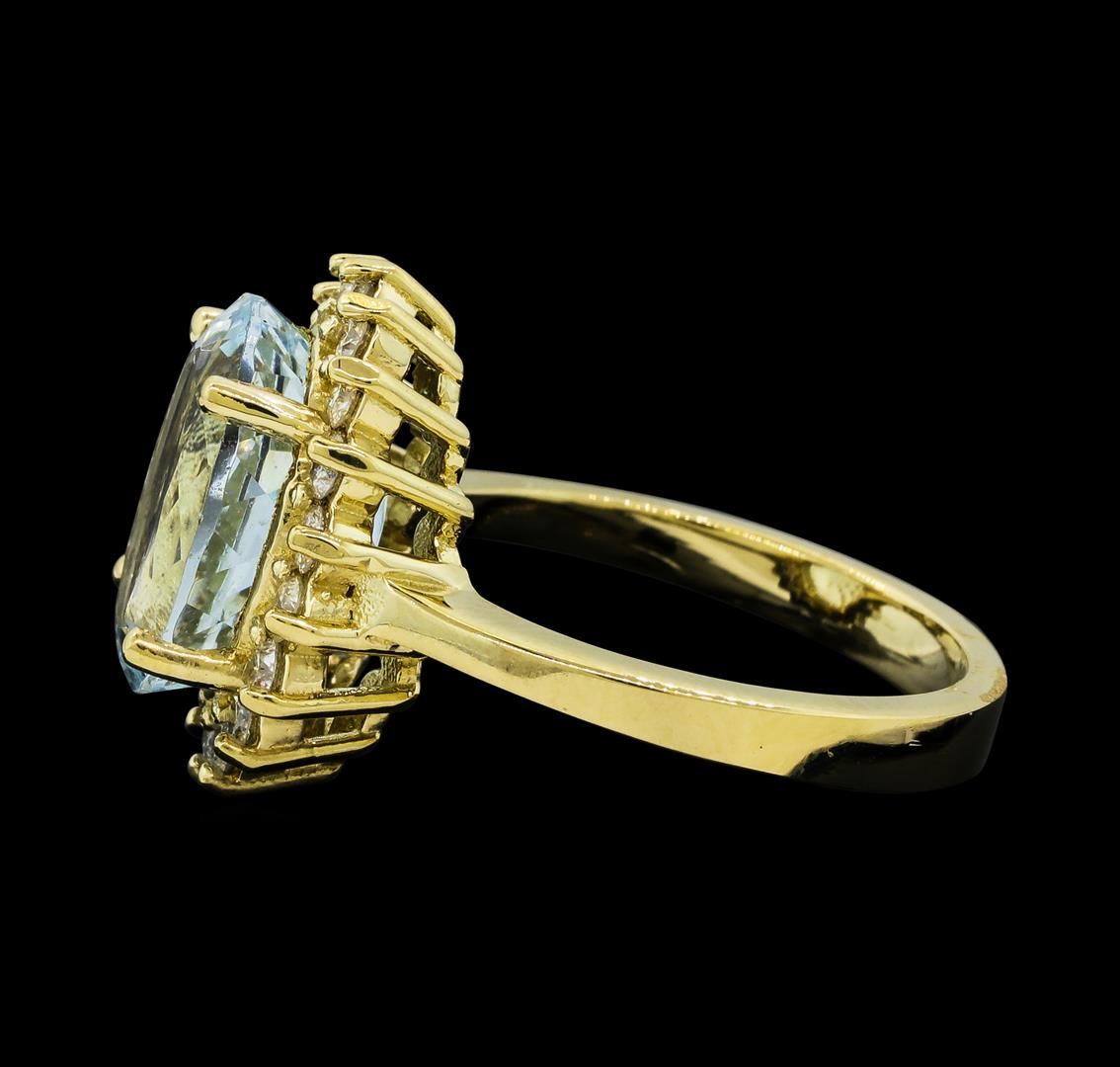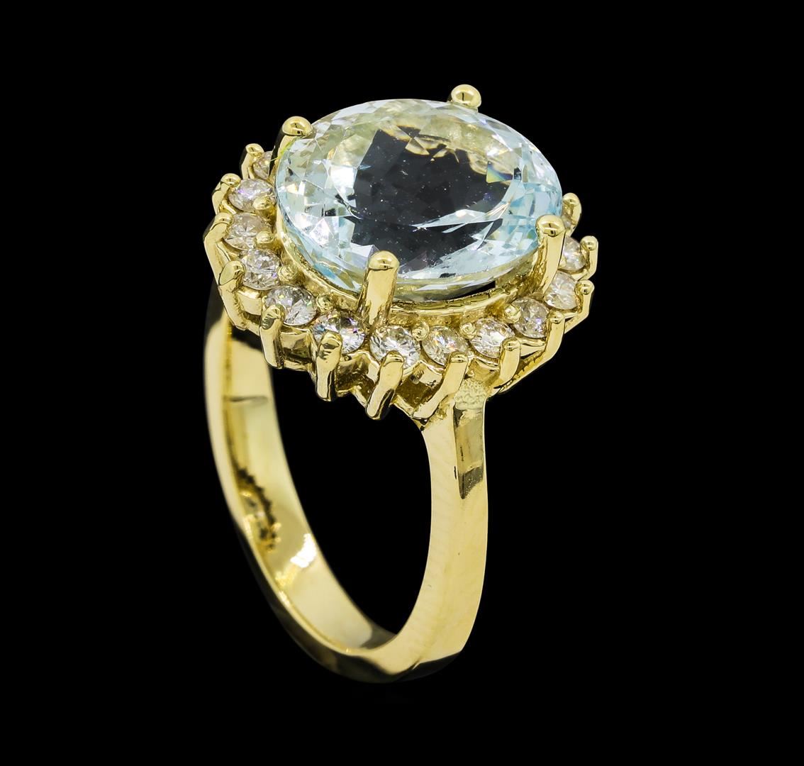 One Aquamarine and Diamond Ring including: 14KT Yellow Gold weighing a total of 5.57 grams, Aquamarine weighing a total of 4.73ct, and 18 Diamonds weighing a total of 0.58ctw.