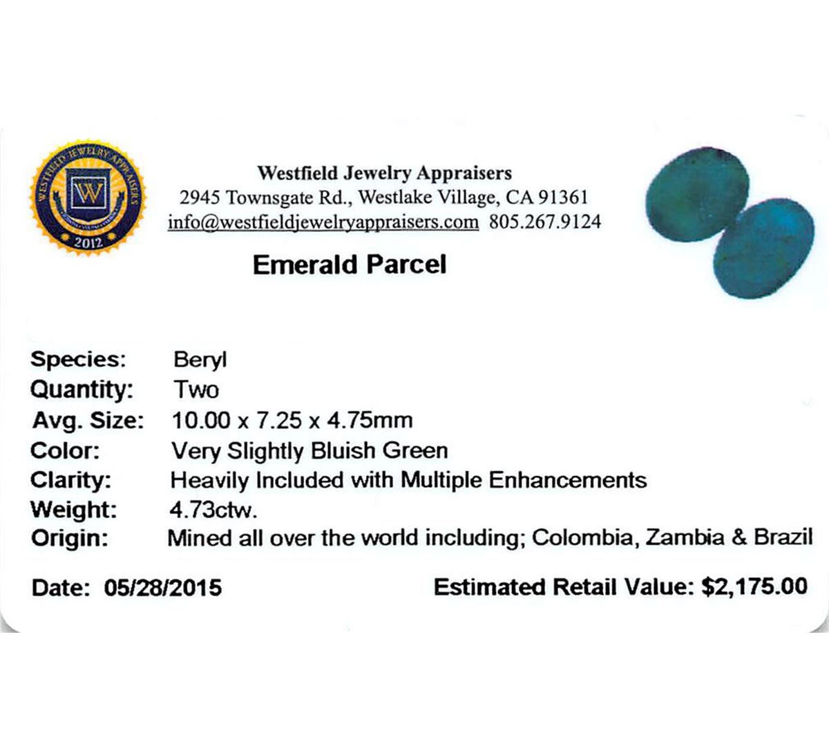Two oval mixed cut natural emeralds, measuring 10.00 x 7.25 x 4.75mm, exact total weight 4.73ct., clarity is heavily included, type III, medium dark, very slightly grayish, very slightly bluish green color, (GIA vslbG 6/3), cut is good. Transmitting light somewhat diffusely, translucent, Naturally occurring internal & external characteristics are present, Indications of multiple laboratory enhancements, including high temperature heat treatment. Westfield Appraised at $2,175.00.