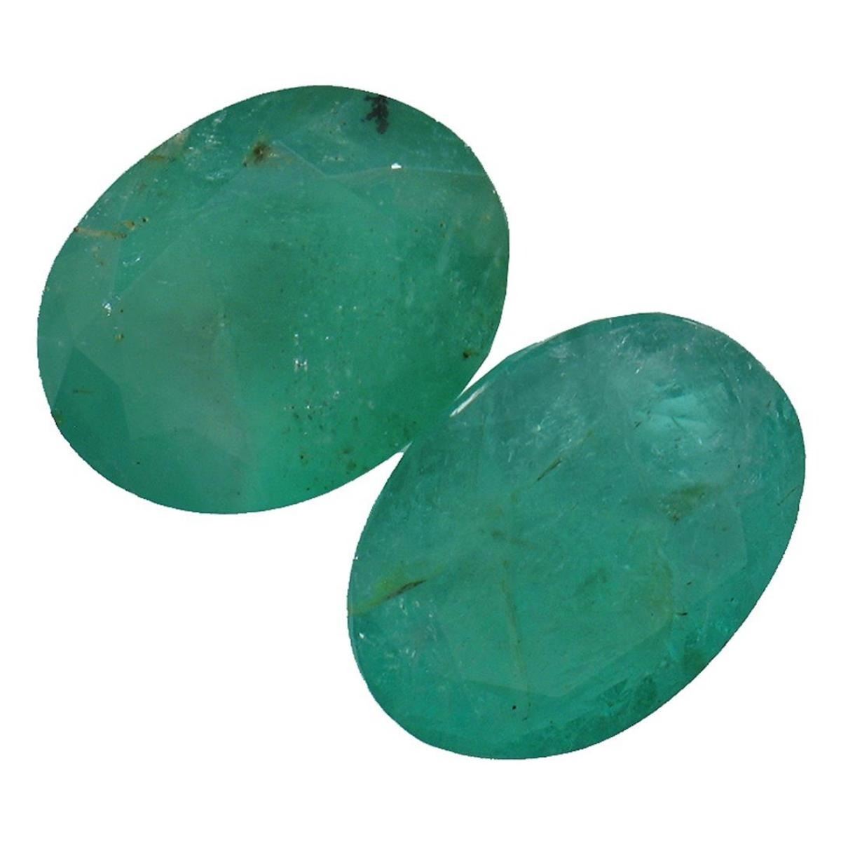 Two oval mixed cut natural emeralds, measuring 10.00 x 7.25 x 4.75mm, exact total weight 4.73ct., clarity is heavily included, type III, medium dark, very slightly grayish, very slightly bluish green color, (GIA vslbG 6/3), cut is good. Transmitting light somewhat diffusely, translucent, Naturally occurring internal & external characteristics are present, Indications of multiple laboratory enhancements, including high temperature heat treatment. Westfield Appraised.