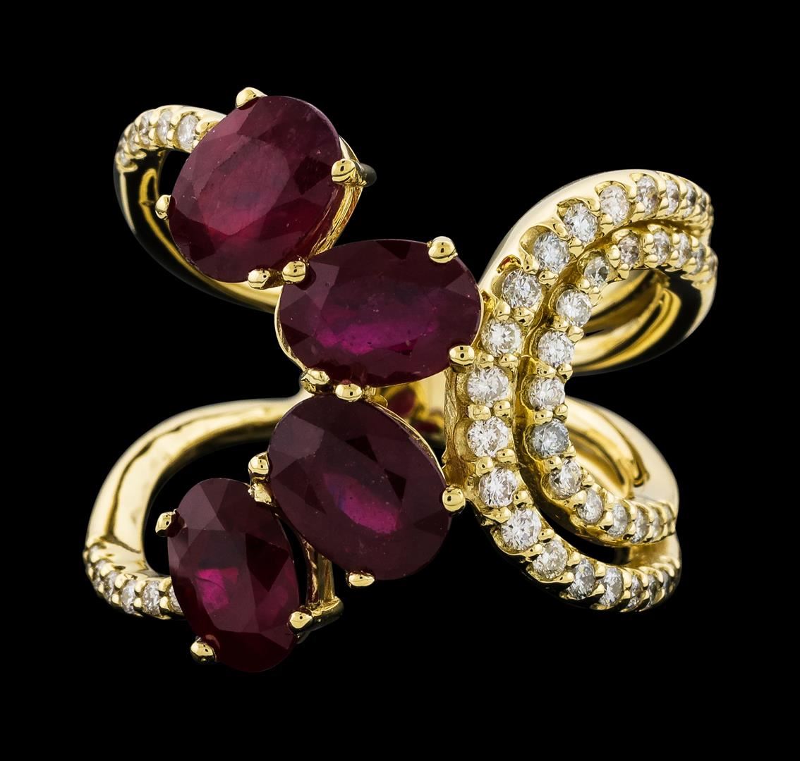 One Ruby and Diamond Ring featuring: 14KT Yellow Gold with a total weight of 6.73 grams, Four Ruby stones with a total weight of 4.73ctw, and 49 Diamonds with a total weight of 0.50ctw.