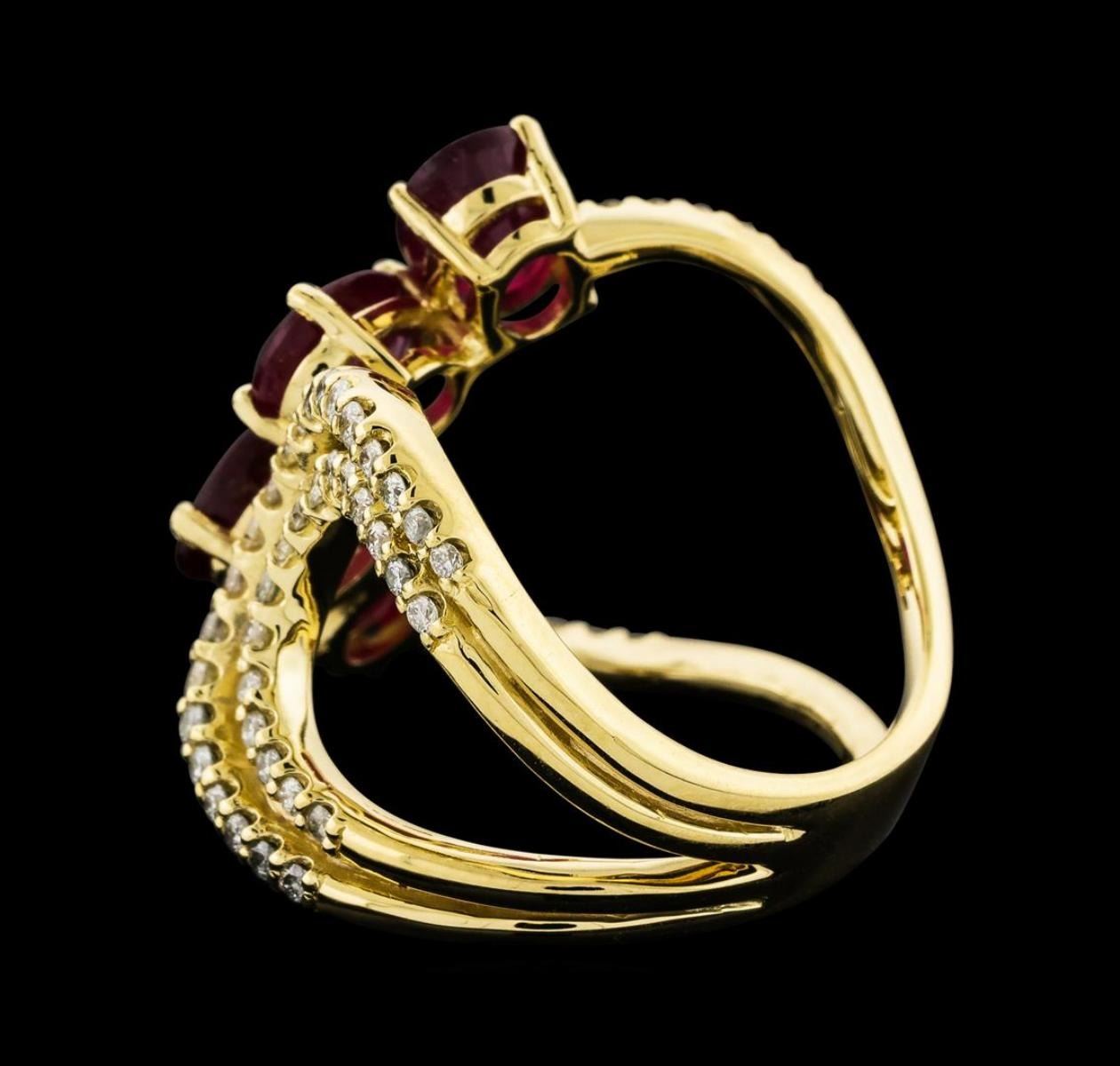 One Ruby and Diamond Ring featuring: 14KT Yellow Gold with a total weight of 6.73 grams, Four Ruby stones with a total weight of 4.73ctw, and 49 Diamonds with a total weight of 0.50ctw.