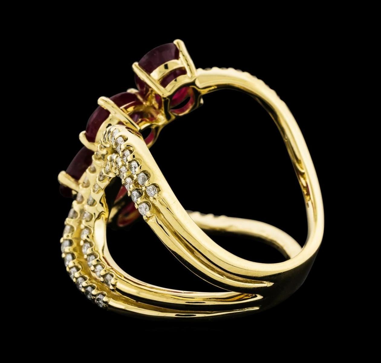 One Ruby and Diamond Ring featuring: 14KT Yellow Gold with a total weight of 6.73 grams, Four Ruby stones with a total weight of 4.73ctw, and 49 Diamonds with a total weight of 0.50 ctw.