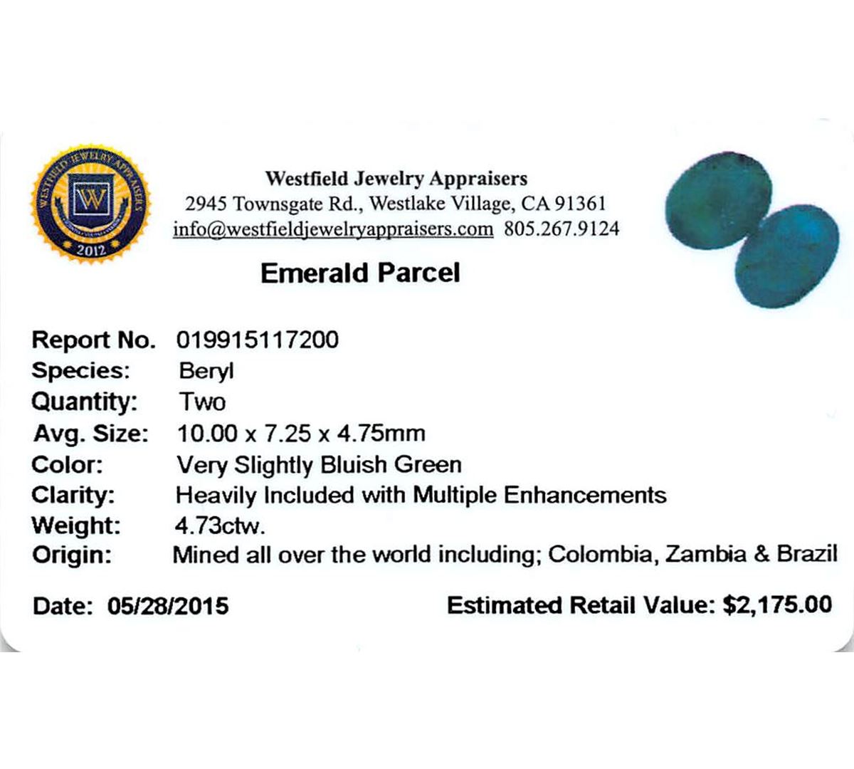 Two oval mixed cut natural emeralds, measuring 10.00 x 7.25 x 4.75mm, exact total weight 4.73ct., clarity is heavily included, type III, medium dark, very slightly grayish, very slightly bluish green color, (GIA vslbG 6/3), cut is good. Transmitting light somewhat diffusely, translucent, Naturally occurring internal & external characteristics are present, Indications of multiple laboratory enhancements, including high temperature heat treatment. Westfield Appraised at $2,175.00.
