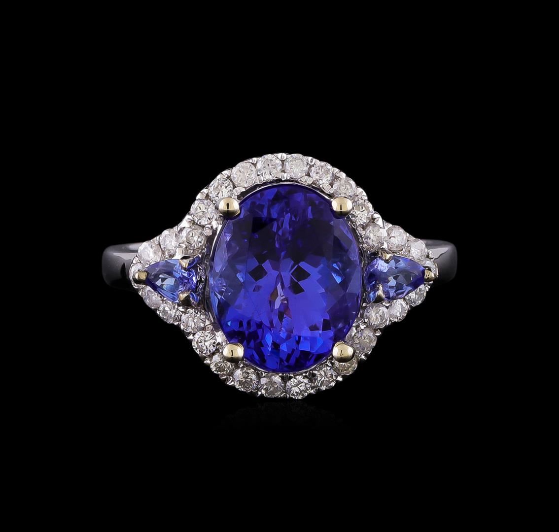 One electronically tested 14KT white gold ladies cast tanzanite and diamond ring with a bright polish finish. The featured tanzanite is set within a diamond bezel supported by mirroring tanzanite and diamond set shoulders, completed by a two millimeter wide band. Trademark is Orianne. Identified with markings of '14K'. Condition is new, good workmanship. Containing: One prong set oval mixed cut natural tanzanite, measuring 10.80 x 8.70 x 6.80mm, approximate weight of 4.49ct., clarity is slightly included, type I, medium dark, very slightly grayish, bluish violet color, (GIA bV 6/3), cut is good. Transmitting light with no distortion, transparent. Graded in the setting. Two prong set pear mixed cut natural tanzanites, measuring 3.75 x 2.55 x 1.66mm, approximate total weight of 0.25ct., clarity is eye clean, type I, medium, slightly grayish, violetish blue color, (GIA vB 5/2), cut is good. Transmitting light with no distortion, transparent. Measurements & the color grade are an average for the pair. Graded in the setting. Tanzanite is a very rare gemstone that is only found in the country of Tanzania. Originally discovered in 1967. Tiffany & Company, named the stone Tanzanite. It is found in the Usumburu Mountains that border the Umba Valley of northern Tanzania. Tanzanite occurs in gray, brown, violet, blue, reddish-purple, & green. The gem is interesting because of its exceptional pleochroism. Rotated in different directions a tanzanite will exhibit multiple changes of color. Tanzanite has a low tolerance to ultrasonic cleaning, and should not be cleaned using this method. Thirty prong set round brilliant cut diamonds approximate total weight of 30 Stones = 0.40ct. The color grade reflects the entire range of color for this group. Graded in the setting. Clarity SI-2 to I-2. Color: F - I. Total Weight of Colored Stones 4.74ct.. Total Weight of Diamonds 0.40ct.. Total Weight of Ring 5.16gm. AIG Appraised at $10,600.00.