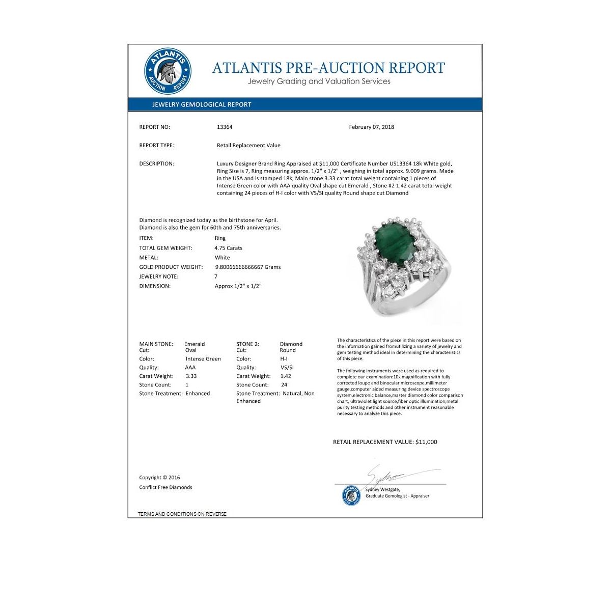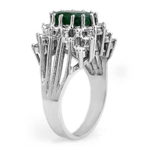 REF-154W2F -13364 ---- 4.75 CTW Emerald & Diamond Ring 18K White Gold ---- Luxury Designer Brand Ring Appraised at $11,000 Certificate Number US13364 18k White gold, Ring Size is 7, Ring measuring approx. 1/2" x 1/2" , weighing in total approx. 9.009 grams. Made in the USA and is stamped 18k, Main stone 3.33 carat total weight containing 1 pieces of Intense Green color with AAA quality Oval shape cut Emerald , Stone #2 1.42 carat total weight containing 24 pieces of H-I color with VS/SI quality Round shape cut Diamond