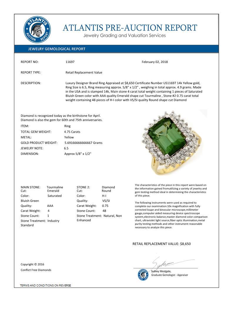 REF-112X5T -11697 ---- 4.75 CTW Green Tourmaline & Diamond Ring 14K Yellow Gold ---- Luxury Designer Brand Ring Appraised at $8,650 Certificate Number US11697 14k Yellow gold, Ring Size is 6.5, Ring measuring approx. 5/8" x 1/2" , weighing in total approx. 4.9 grams. Made in the USA and is stamped 14k, Main stone 4 carat total weight containing 1 pieces of Saturated Bluish Green color with AAA quality Emerald shape cut Tourmaline , Stone #2 0.75 carat total weight containing 48 pieces of H-I color with VS/SI quality Round shape cut Diamond