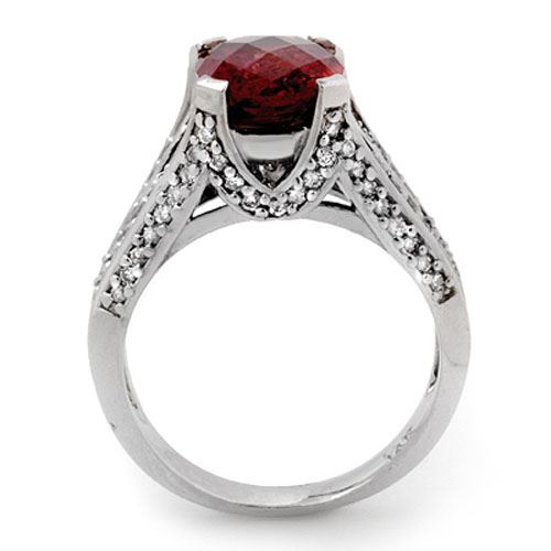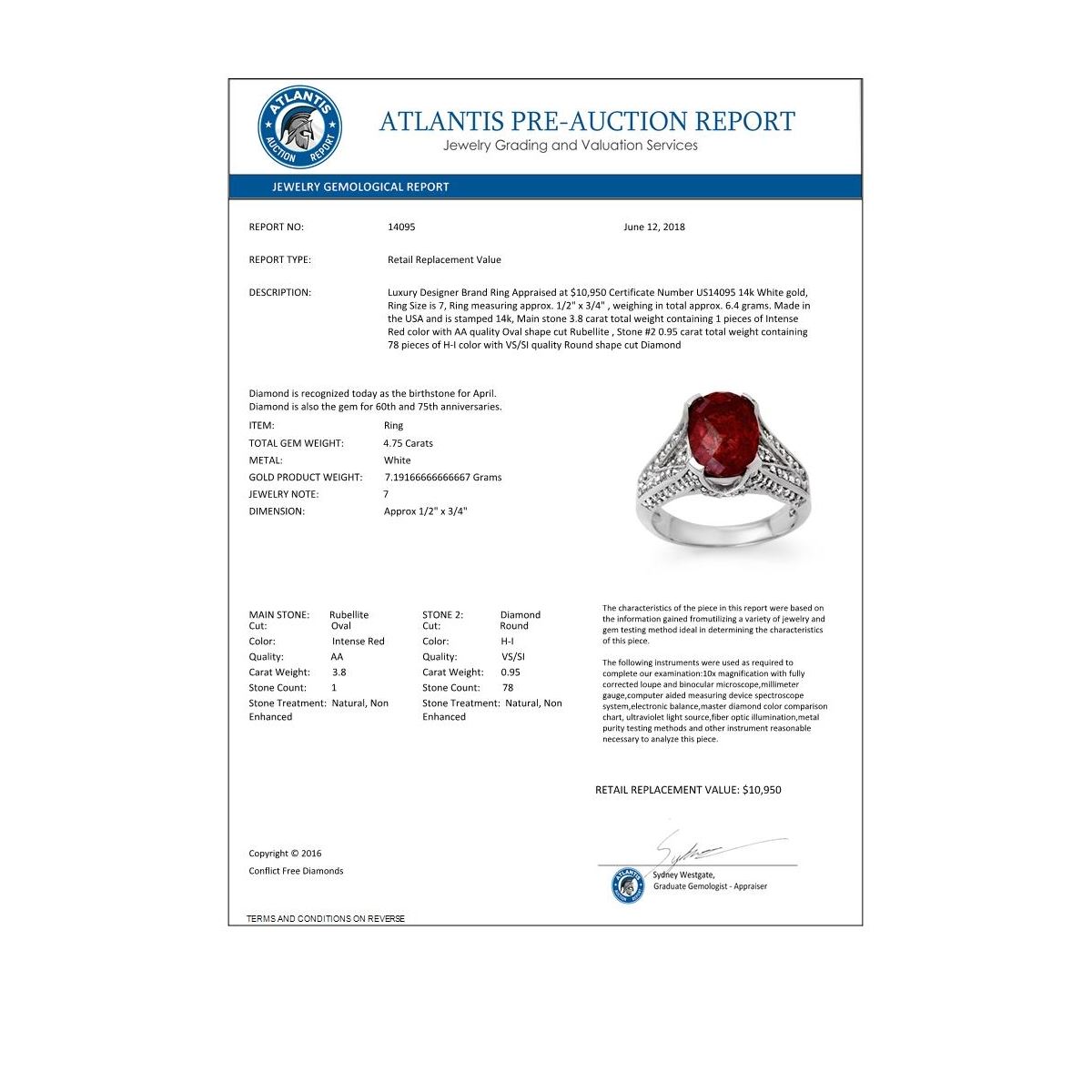 REF-142X4T -14095 ---- 4.75 CTW Rubellite & Diamond Ring 14K White Gold ---- Luxury Designer Brand Ring Appraised at $10,950 Certificate Number US14095 14k White gold, Ring Size is 7, Ring measuring approx. 1/2" x 3/4" , weighing in total approx. 6.4 grams. Made in the USA and is stamped 14k, Main stone 3.8 carat total weight containing 1 pieces of Intense Red color with AA quality Oval shape cut Rubellite , Stone #2 0.95 carat total weight containing 78 pieces of H-I color with VS/SI quality Round shape cut Diamond