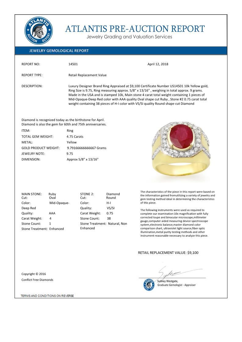 REF-118F2N -14501 ---- 4.75 CTW Ruby & Diamond Men's Ring 10K Yellow Gold ---- Luxury Designer Brand Ring Appraised at $9,100 Certificate Number US14501 10k Yellow gold, Ring Size is 9.75, Ring measuring approx. 5/8" x 13/16" , weighing in total approx. 9 grams. Made in the USA and is stamped 10k, Main stone 4 carat total weight containing 1 pieces of Mid-Opaque-Deep Red color with AAA quality Oval shape cut Ruby , Stone #2 0.75 carat total weight containing 38 pieces of H-I color with VS/SI quality Round shape cut Diamond