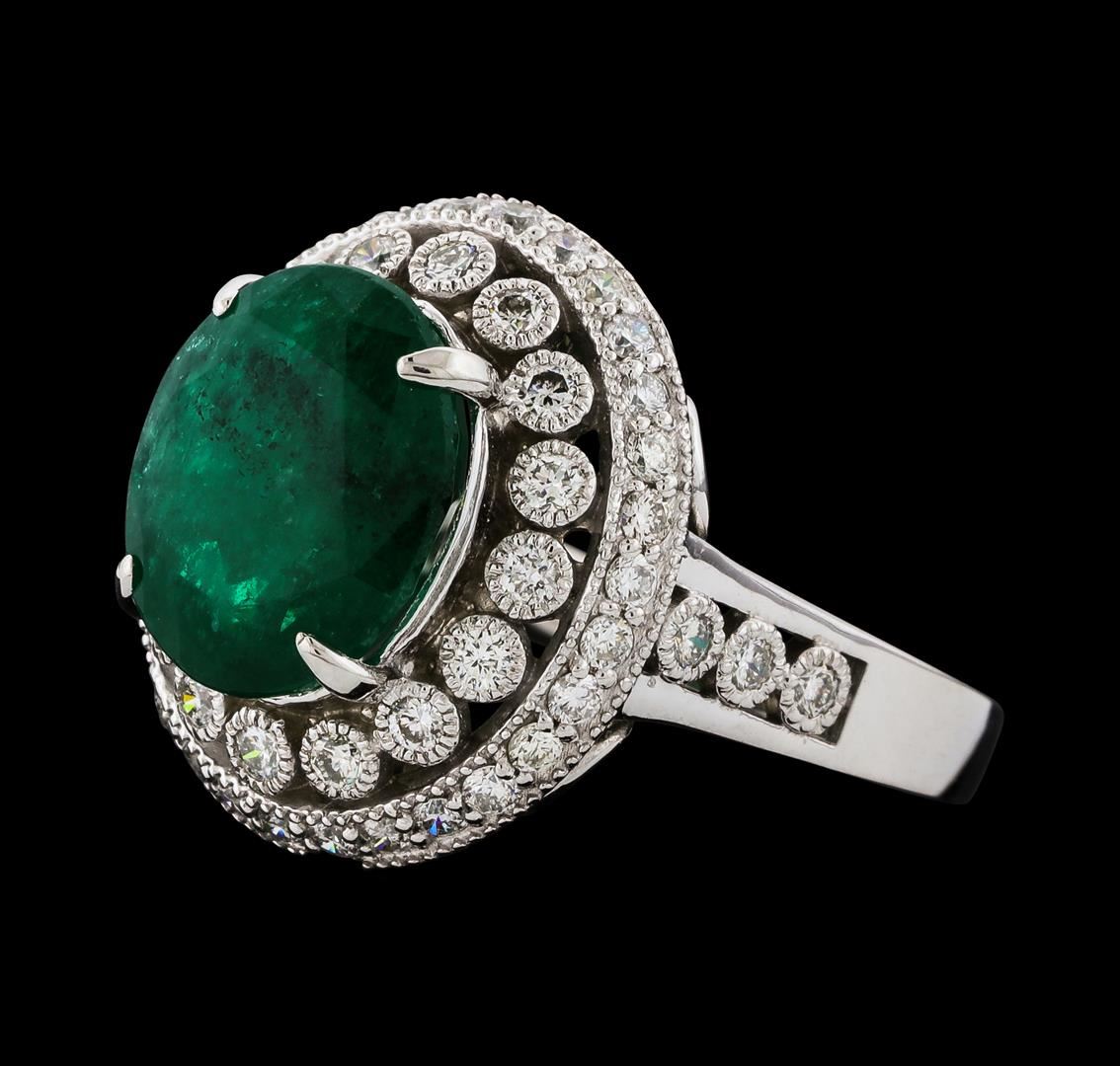 One electronically tested 14KT white gold lady's cast fashion ring with a cathedral double basket halo with a bright polish with milgrain detailing finish. The featured lady's ring has a shank measuring 2.30 millimeters wide. Identified with markings of 'K14'. Condition is new, good workmanship. Containing: One prong set oval modified mixed cut natural emerald, measuring 11.62 x 9.45 x 6.65mm, (depth est.) 14%. bulge factor, approximate weight of 4.75ct., clarity is heavily included, medium dark, moderately strong, green color, (GIA G 6/4), cut is good. Transmitting light somewhat diffusely, semi-transparent to translucent. Naturally occurring internal & external characteristics are present. Indications of oil residue. Colored gemstones are presumed to have been subjected to commonly used enhancement processes. Graded in the setting. Twenty-Two bezel set round brilliant cut diamonds, measuring 1.80 - 1.70 x 1.09mm (depth est.) approximate total weight of 22 Stones = 0.45ct. Graded in the setting. Clarity SI-1 to SI-2. Color: G - H Cut Good Thirty prong set round brilliant cut diamonds, measuring 1.60 - 1.55 x 0.98mm (depth est.) approximate total weight of 30 Stones = 0.46ct. Graded in the setting. Clarity SI-1 to SI-3. Color: G - H Cut Good. Total Weight of Colored Stones 4.75ct.. Total Weight of Diamonds 0.91ct.. Total Weight of Ring 6.70gm. GAS Appraised at $8,505.00.