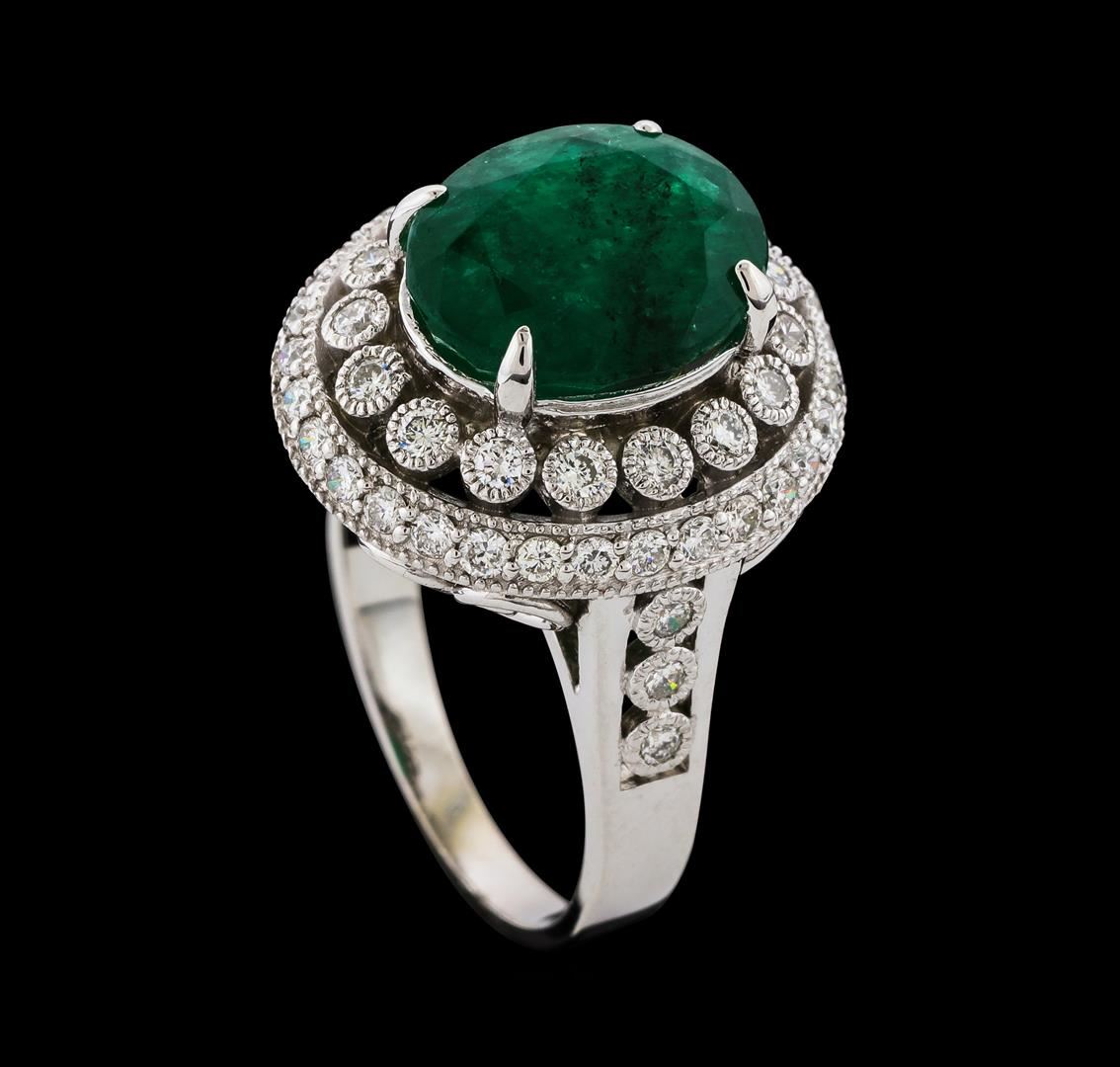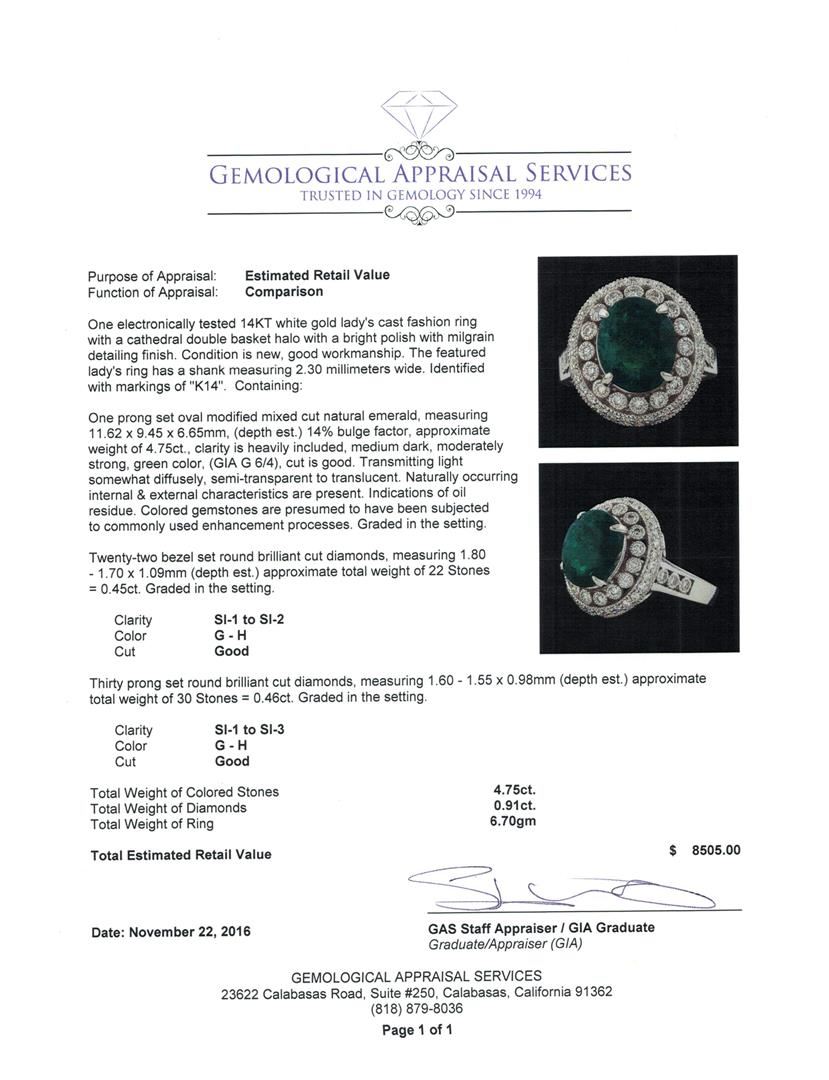 One electronically tested 14KT white gold lady's cast fashion ring with a cathedral double basket halo with a bright polish with milgrain detailing finish. The featured lady's ring has a shank measuring 2.30 millimeters wide. Identified with markings of 'K14'. Condition is new, good workmanship. Containing: One prong set oval modified mixed cut natural emerald, measuring 11.62 x 9.45 x 6.65mm, (depth est.) 14%. bulge factor, approximate weight of 4.75ct., clarity is heavily included, medium dark, moderately strong, green color, (GIA G 6/4), cut is good. Transmitting light somewhat diffusely, semi-transparent to translucent. Naturally occurring internal & external characteristics are present. Indications of oil residue. Colored gemstones are presumed to have been subjected to commonly used enhancement processes. Graded in the setting. Twenty-Two bezel set round brilliant cut diamonds, measuring 1.80 - 1.70 x 1.09mm (depth est.) approximate total weight of 22 Stones = 0.45ct. Graded in the setting. Clarity SI-1 to SI-2. Color: G - H Cut Good Thirty prong set round brilliant cut diamonds, measuring 1.60 - 1.55 x 0.98mm (depth est.) approximate total weight of 30 Stones = 0.46ct. Graded in the setting. Clarity SI-1 to SI-3. Color: G - H Cut Good. Total Weight of Colored Stones 4.75ct.. Total Weight of Diamonds 0.91ct.. Total Weight of Ring 6.70gm. GAS Appraised at $8,505.00.