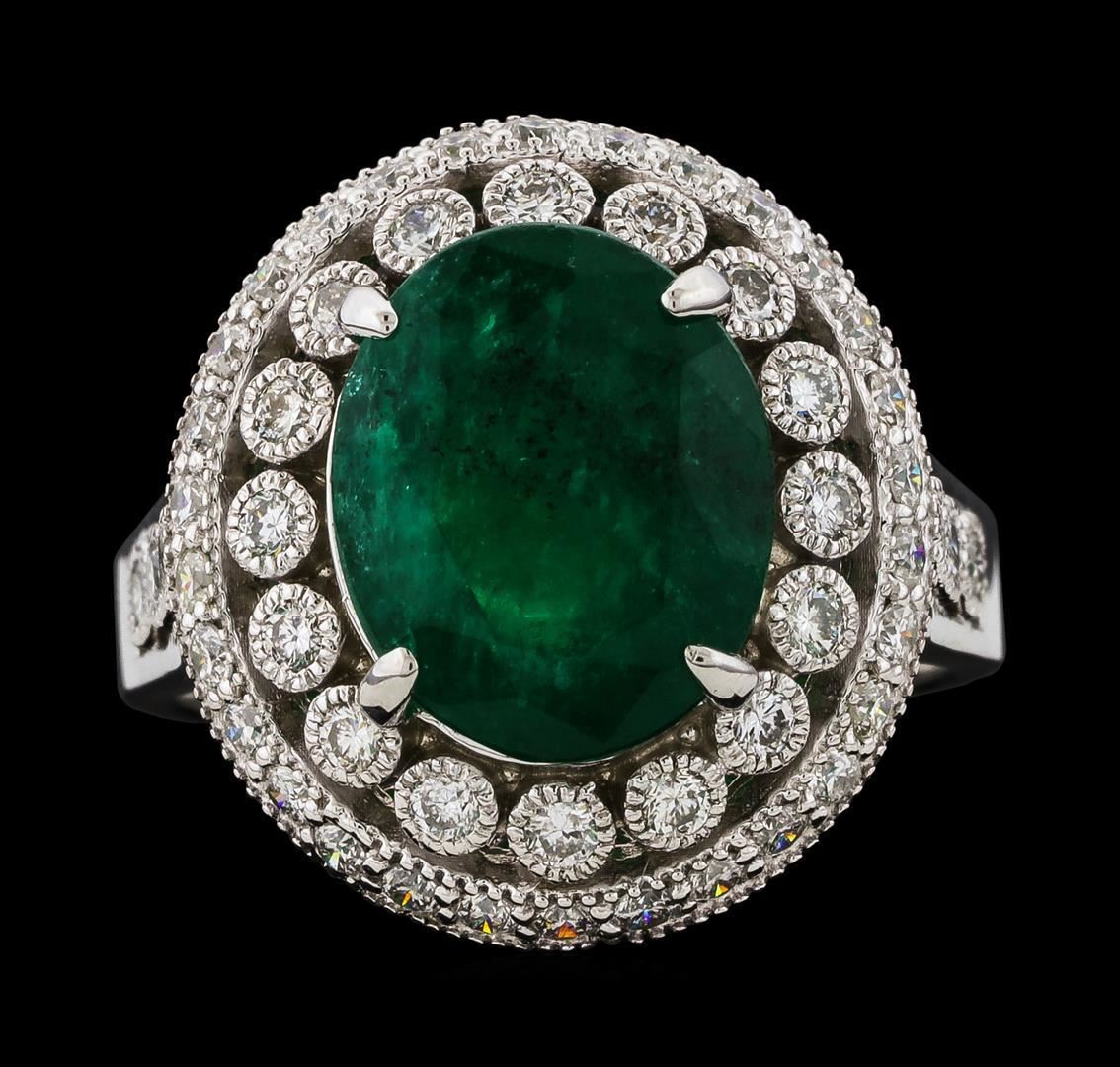 One electronically tested 14KT white gold lady's cast fashion ring with a cathedral double basket halo with a bright polish with milgrain detailing finish. The featured lady's ring has a shank measuring 2.30 millimeters wide. Identified with markings of 'K14'. Condition is new, good workmanship. Containing: One prong set oval modified mixed cut natural emerald, measuring 11.62 x 9.45 x 6.65mm, (depth est.) 14%. bulge factor, approximate weight of 4.75ct., clarity is heavily included, medium dark, moderately strong, green color, (GIA G 6/4), cut is good. Transmitting light somewhat diffusely, semi-transparent to translucent. Naturally occurring internal & external characteristics are present. Indications of oil residue. Colored gemstones are presumed to have been subjected to commonly used enhancement processes. Graded in the setting. Twenty-Two bezel set round brilliant cut diamonds, measuring 1.80 - 1.70 x 1.09mm (depth est.) approximate total weight of 22 Stones = 0.45ct. Graded in the setting. Clarity SI-1 to SI-2. Color: G - H Cut Good Thirty prong set round brilliant cut diamonds, measuring 1.60 - 1.55 x 0.98mm (depth est.) approximate total weight of 30 Stones = 0.46ct. Graded in the setting. Clarity SI-1 to SI-3. Color: G - H Cut Good. Total Weight of Colored Stones 4.75ct.. Total Weight of Diamonds 0.91ct.. Total Weight of Ring 6.70gm. GAS Appraised.