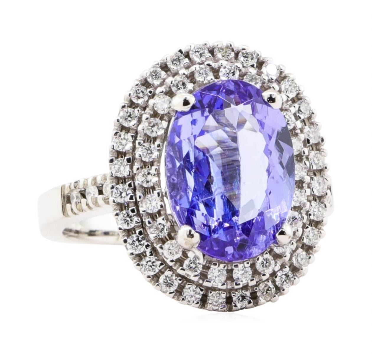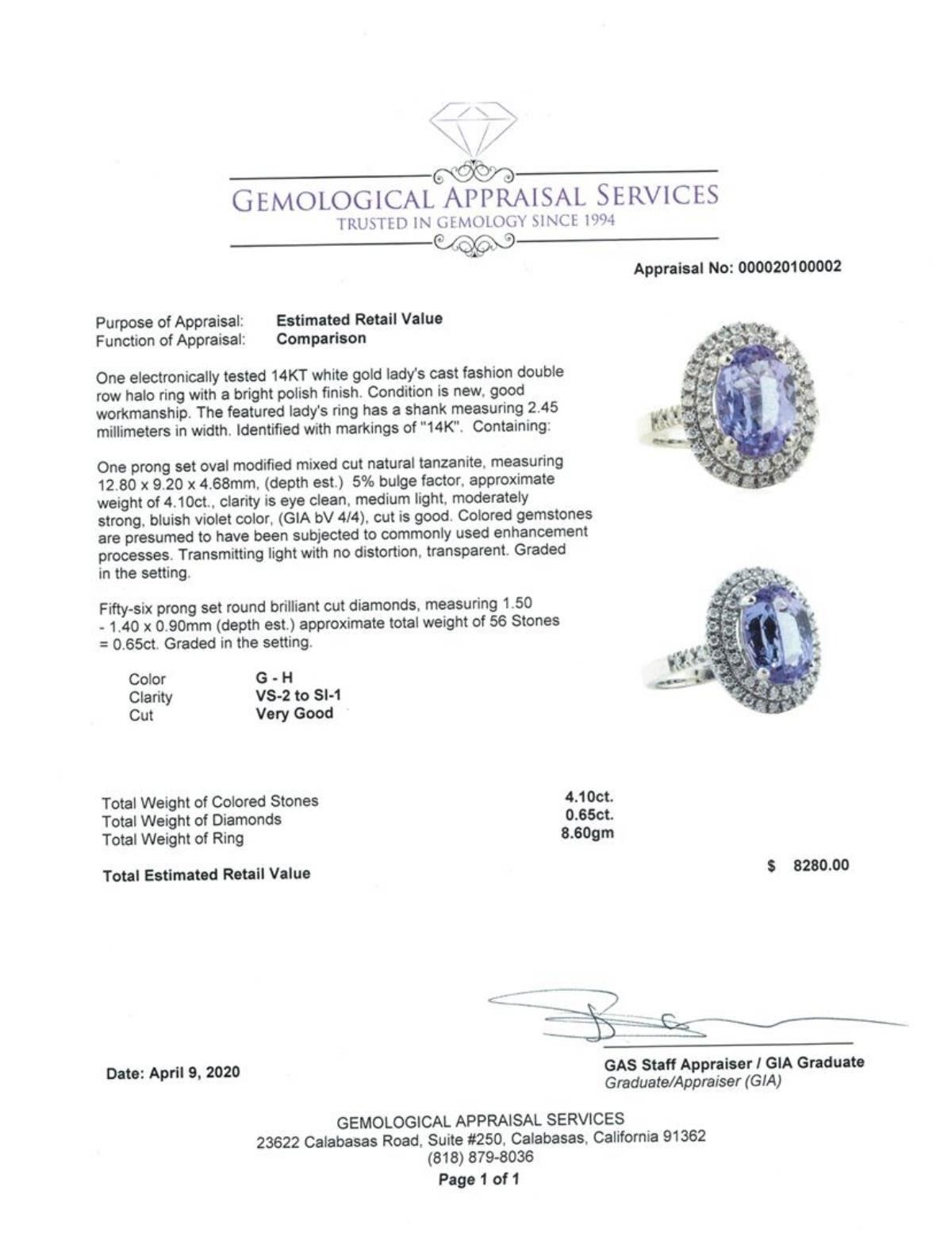 One electronically tested 14KT white gold lady's cast fashion double row halo ring with a bright polish finish. The featured lady's ring has a shank measuring 2.45 millimeters in width. Identified with markings of '14K'. Condition is new, good workmanship. Containing: One prong set oval modified mixed cut natural tanzanite, measuring 12.80 x 9.20 x 4.68mm, (depth est.) 5%. bulge factor, approximate weight of 4.10 ct., clarity is eye clean, medium light, moderately strong, bluish violet color, (GIA bV 4/4), cut is good. Colored gemstones are presumed to have been subjected to commonly used enhancement processes. Transmitting light with no distortion, transparent. Graded in the setting. Fifty-Six prong set round brilliant cut diamonds, measuring 1.50 - 1.40 x 0.90mm (depth est.) approximate total weight of 56 Stones = 0.65ct. Graded in the setting. Color G - H Clarity VS-2 to SI-1 Cut Very Good. Total Weight of Colored Stones 4.10 ct.. Total Weight of Diamonds 0.65ct.. Total Weight of Ring 8.60gm GAS Appraised at $8280.00. GAS Appraised.