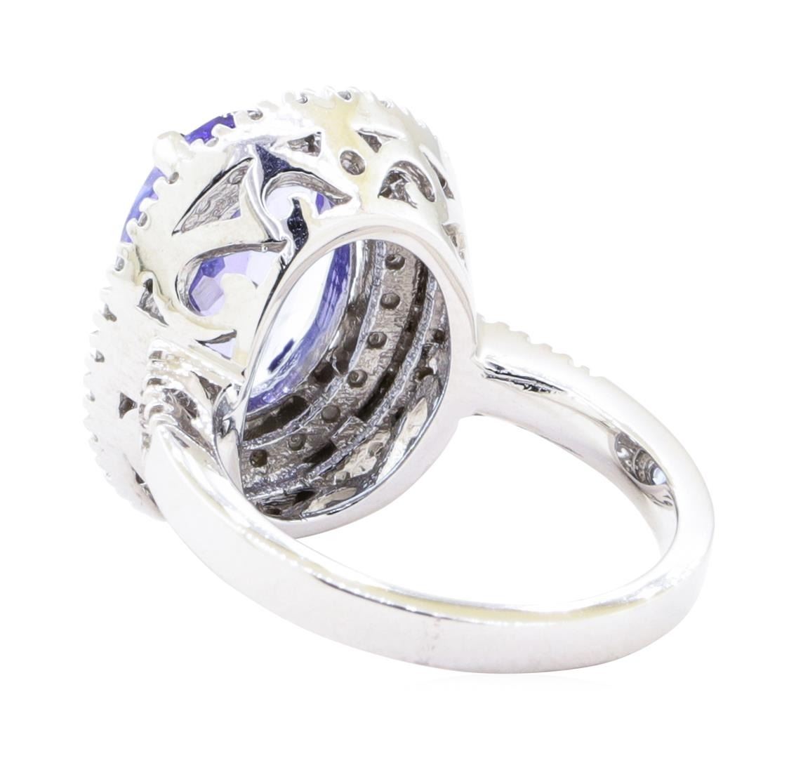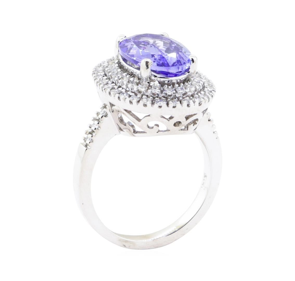 One electronically tested 14KT white gold lady's cast fashion double row halo ring with a bright polish finish. The featured lady's ring has a shank measuring 2.45 millimeters in width. Identified with markings of '14K'. Condition is new, good workmanship. Containing: One prong set oval modified mixed cut natural tanzanite, measuring 12.80 x 9.20 x 4.68mm, (depth est.) 5%. bulge factor, approximate weight of 4.10 ct., clarity is eye clean, medium light, moderately strong, bluish violet color, (GIA bV 4/4), cut is good. Colored gemstones are presumed to have been subjected to commonly used enhancement processes. Transmitting light with no distortion, transparent. Graded in the setting. Fifty-Six prong set round brilliant cut diamonds, measuring 1.50 - 1.40 x 0.90mm (depth est.) approximate total weight of 56 Stones = 0.65ct. Graded in the setting. Color G - H Clarity VS-2 to SI-1 Cut Very Good. Total Weight of Colored Stones 4.10 ct.. Total Weight of Diamonds 0.65ct.. Total Weight of Ring 8.60gm GAS Appraised at $8280.00. GAS Appraised.