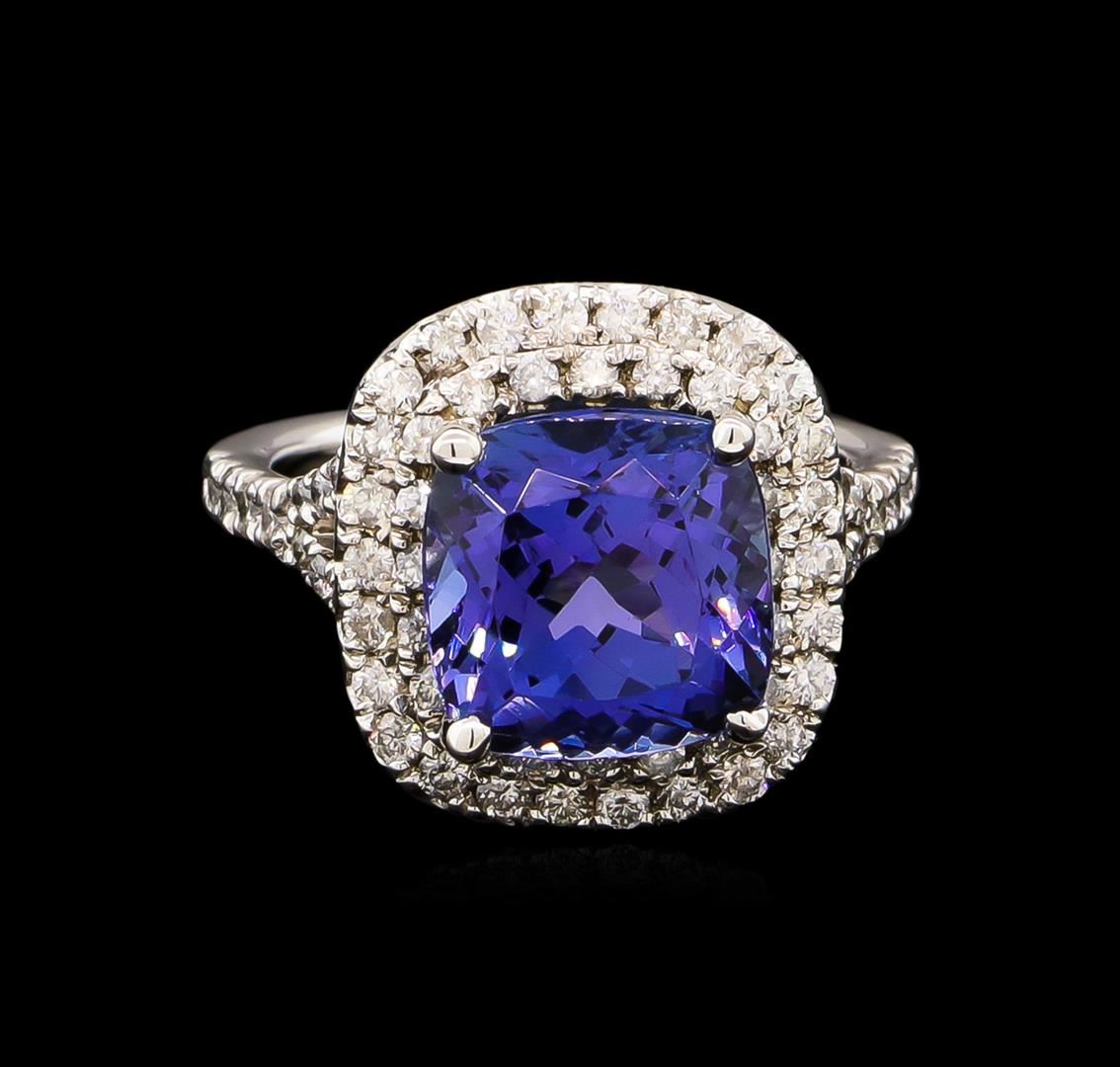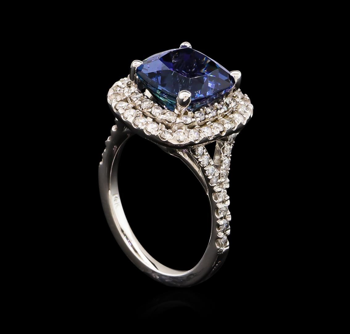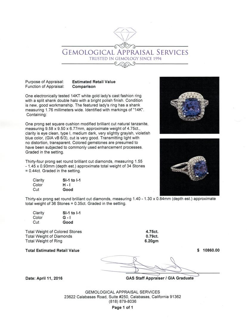 One electronically tested 14KT white gold lady's cast fashion ring with a split shank double halo with a bright polish finish. The featured lady's ring has a shank measuring 1.76 millimeters wide. Identified with markings of "14K". Condition is new, good workmanship. Containing: One prong set square cushion modified brilliant cut natural tanzanite, measuring 9.58 x 9.50 x 6.77mm, approximate weight of 4.75ct., clarity is eye clean, type I, medium dark, very slightly grayish, violetish blue color, (GIA vB 6/3), cut is very good. Transmitting light with no distortion, transparent. Colored gemstones are presumed to have been subjected to commonly used enhancement processes. Graded in the setting. Thirty-Four prong set round brilliant cut diamonds, measuring 1.55 - 1.45 x 0.93mm (depth est.) approximate total weight of 34 Stones = 0.44ct. Graded in the setting. Clarity: SI-1 to I-1. Color: H - I. Cut Good Thirty-Six prong set round brilliant cut diamonds, measuring 1.40 - 1.30 x 0.84mm (depth est.) approximate total weight of 36 Stones = 0.35ct. Graded in the setting. Clarity: SI-1 to I-1. Color: G - I. Cut Good. Total Weight of Colored Stones 4.75ct. Total Weight of Diamonds 0.79ct. Total Weight of Ring 6.20gm. GAS Appraised at $10,860.00.