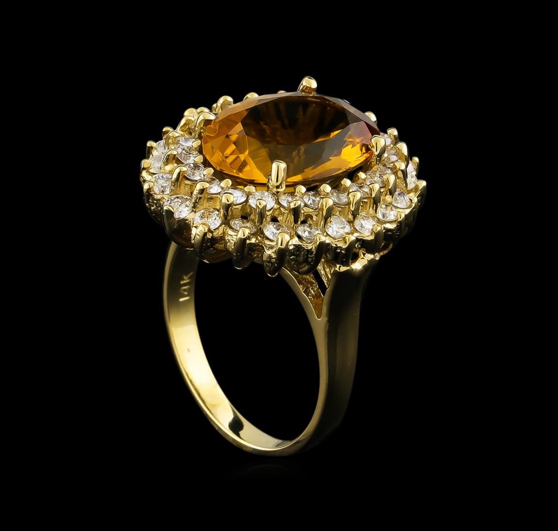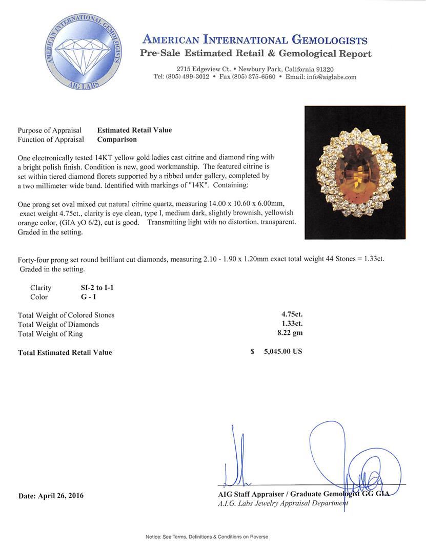 One electronically tested 14KT yellow gold ladies cast citrine and diamond ring with a bright polish finish. The featured citrine is set within tiered diamond florets supported by a ribbed under gallery, completed by a two millimeter wide band. Identified with markings of "14K". Condition is new, good workmanship. Containing: One prong set oval mixed cut natural citrine quartz, measuring 14.00 x 10.60 x 6.00mm, exact weight 4.75ct., clarity is eye clean, type I, medium dark, slightly brownish, yellowish orange color, (GIA yO 6/2), cut is good. Transmitting light with no distortion, transparent. Graded in the setting. Forty-Four prong set round brilliant cut diamonds, measuring 2.10 - 1.90 x 1.20mm exact total weight 44 Stones = 1.33ct. Graded in the setting. Clarity: SI-2 to I-1. Color: G - I. Total Weight of Colored Stones 4.75ct. Total Weight of Diamonds 1.33ct. Total Weight of Ring 8.22gm. AIG Appraised at $5,045.00.