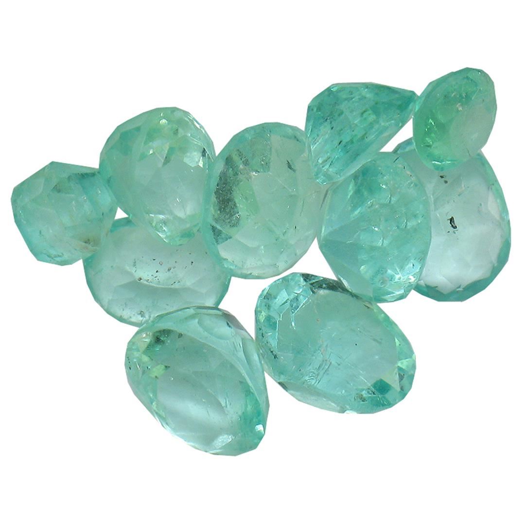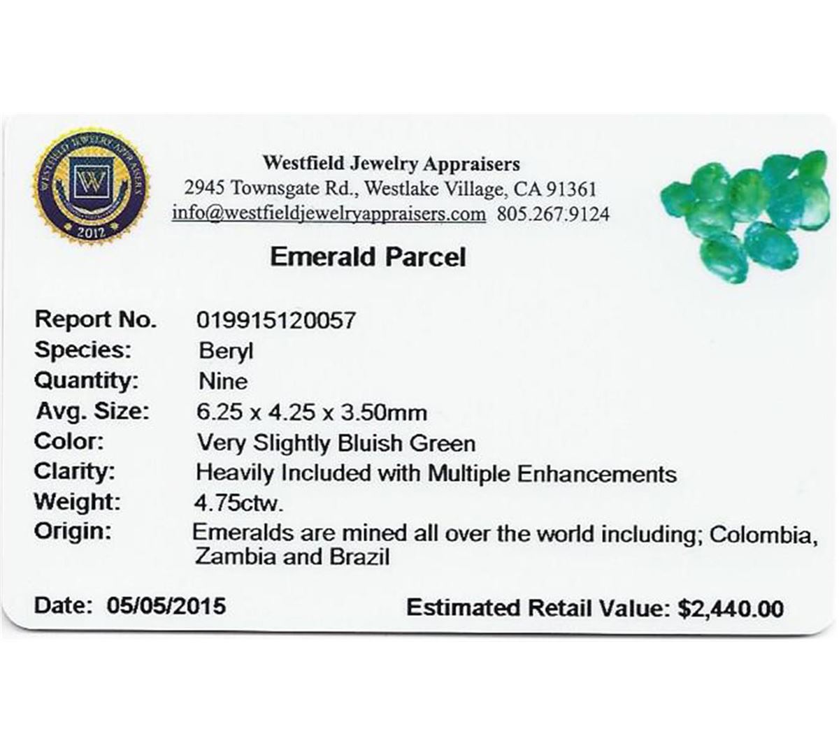 Nine oval mixed cut natural emeralds, measuring 6.00 x 4.25 x 3.50mm, approximate total weight of 4.75ct., clarity is moderately included, type III, medium dark, moderately strong, very slightly bluish green color, (GIA vslbG 6/4), cut is good. Indications of multiple laboratory enhancements, including high temperature heat treatment. Westfield Appraised at $2,440.00.