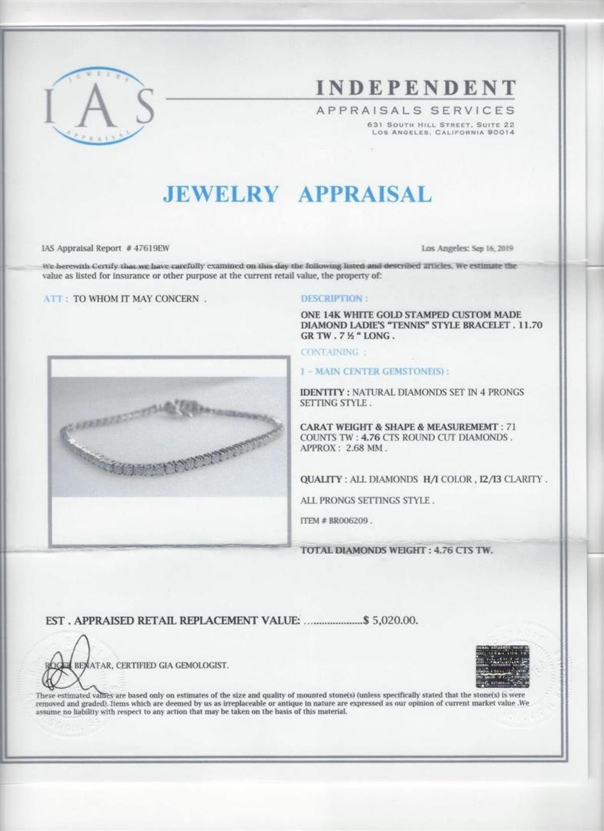 One 4.76ctw Diamond Bracelet - 14KT White Gold. IAS certified. See Appraisal for more details.