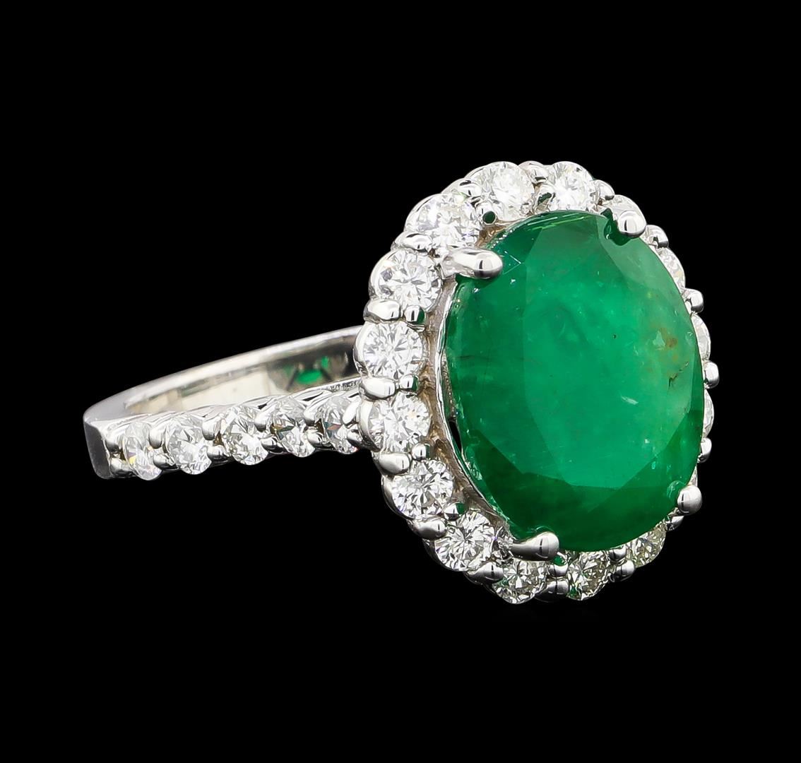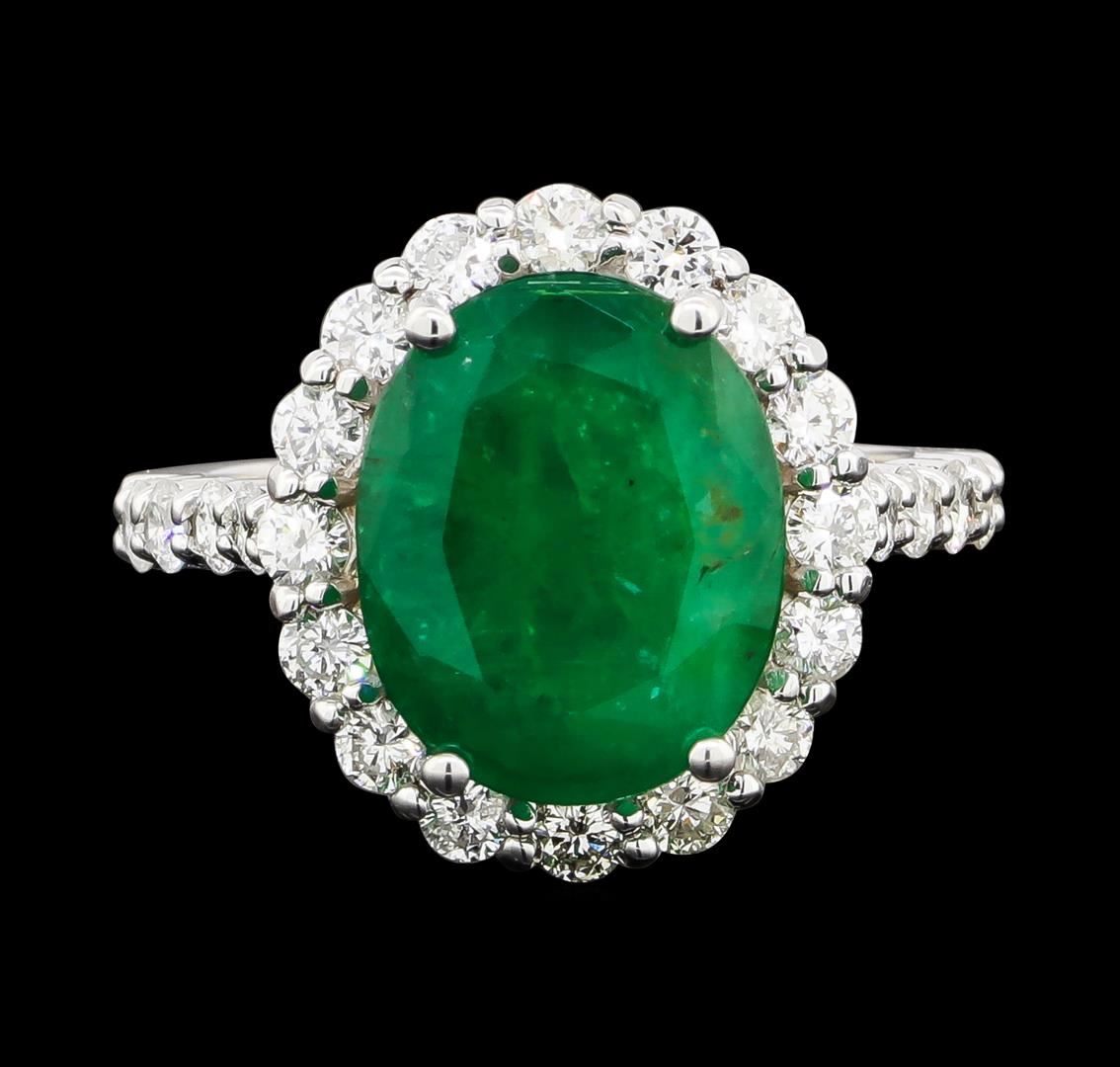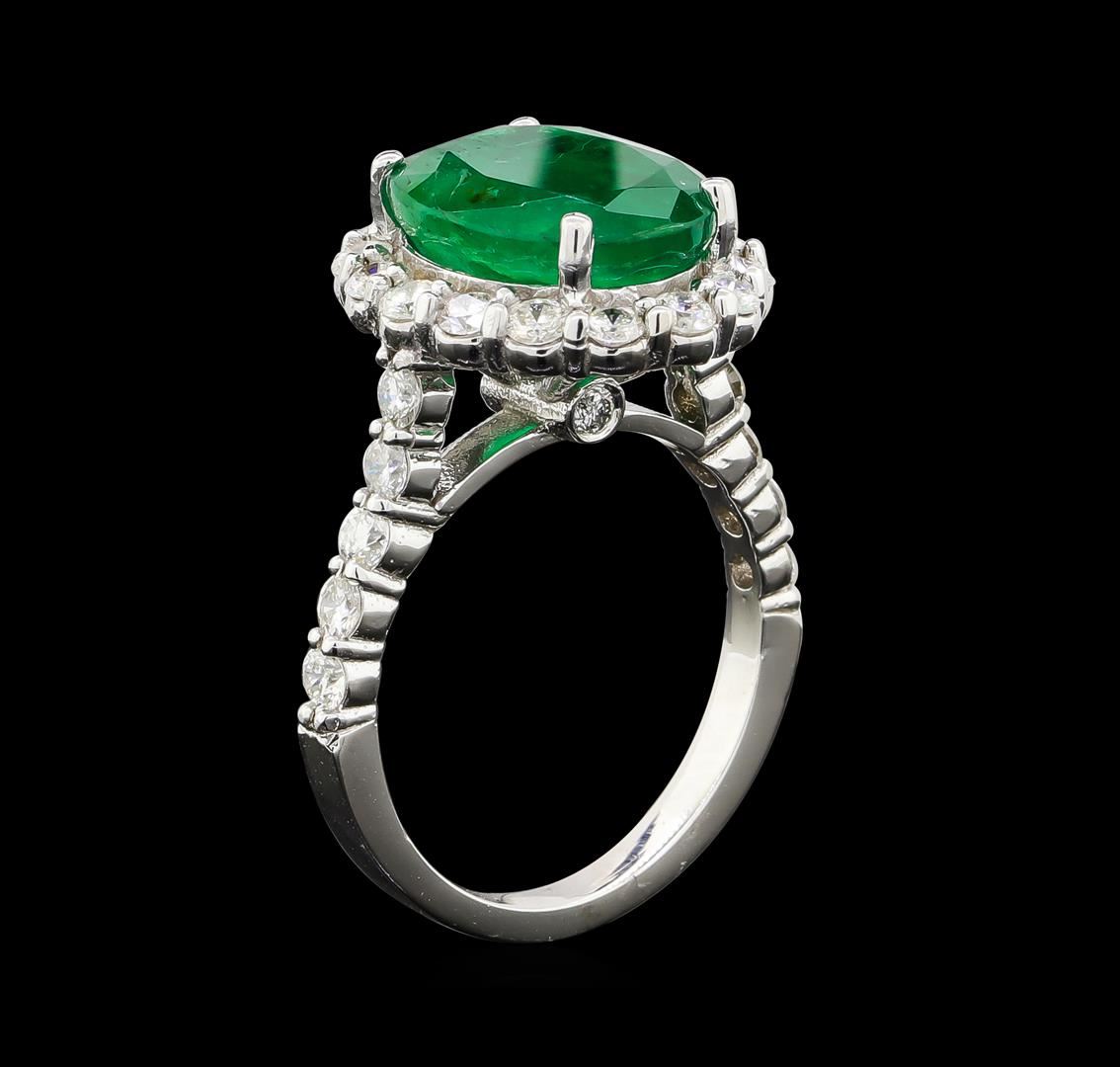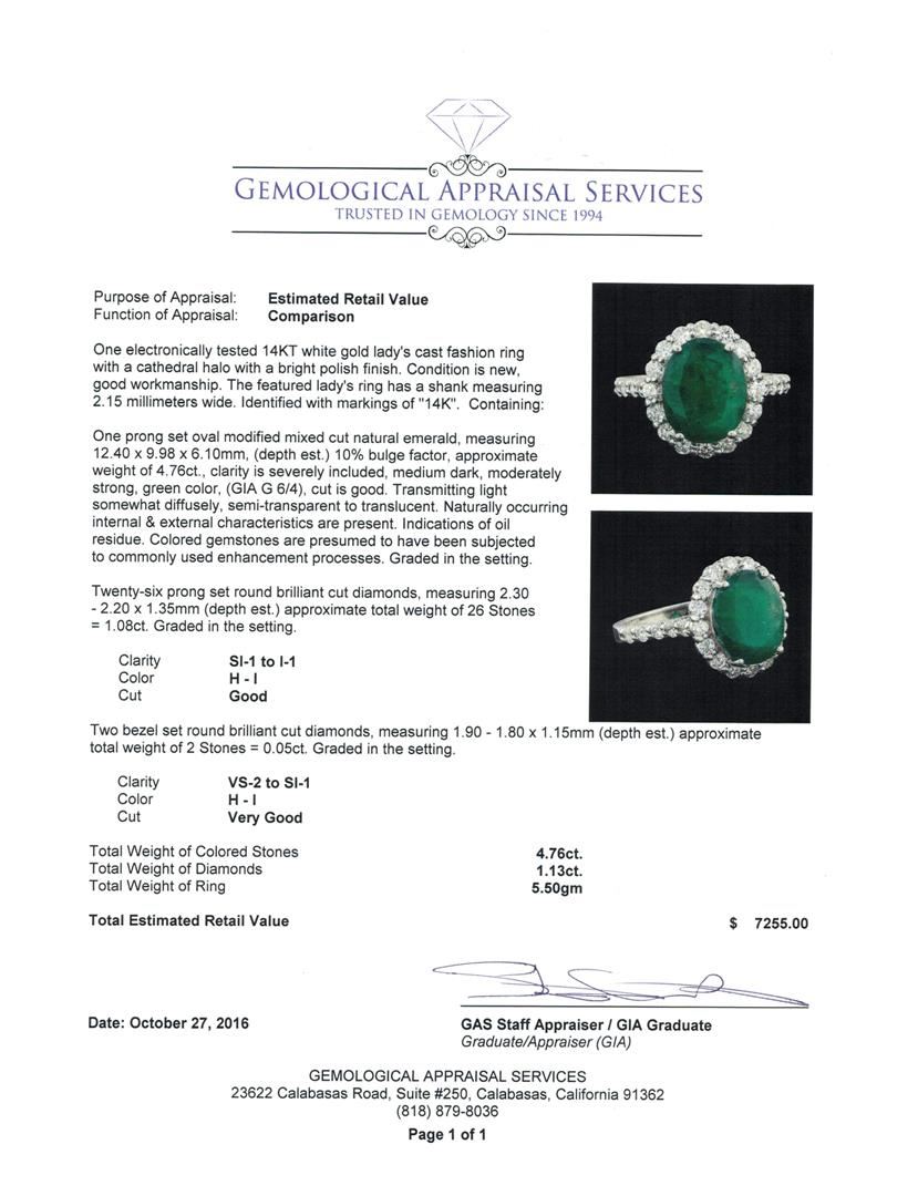 One electronically tested 14KT white gold lady's cast fashion ring with a cathedral halo with a bright polish finish. The featured lady's ring has a shank measuring 2.15 millimeters wide. Identified with markings of '14K'. Condition is new, good workmanship. Containing: One prong set oval modified mixed cut natural emerald, measuring 12.40 x 9.98 x 6.10mm, (depth est.) 10%. bulge factor, approximate weight of 4.76ct., clarity is severely included, medium dark, moderately strong, green color, (GIA G 6/4), cut is good. Transmitting light somewhat diffusely, semi-transparent to translucent. Naturally occurring internal & external characteristics are present. Indications of oil residue. Colored gemstones are presumed to have been subjected to commonly used enhancement processes. Graded in the setting. Twenty-Six prong set round brilliant cut diamonds, measuring 2.30 - 2.20 x 1.35mm (depth est.) approximate total weight of 26 Stones = 1.08ct. Graded in the setting. Clarity SI-1 to I-1. Color: H - I Cut Good Two bezel set round brilliant cut diamonds, measuring 1.90 - 1.80 x 1.15mm (depth est.) approximate total weight of 2 Stones = 0.05ct. Graded in the setting. Clarity VS-2 to SI-1. Color: H - I Cut Very Good. Total Weight of Colored Stones 4.76ct.. Total Weight of Diamonds 1.13ct.. Total Weight of Ring 5.50gm. GAS Appraised at $7,255.00.
