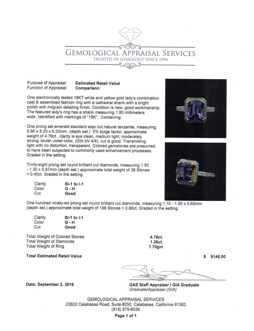 One electronically tested 18KT white and yellow gold lady's combination cast & assembled fashion ring with a cathedral shank with a bright polish with milgrain detailing finish. The featured lady's ring has a shank measuring 1.80 millimeters wide. Identified with markings of '18K'. Condition is new, good workmanship. Containing: One prong set emerald standard step cut natural tanzanite, measuring 9.86 x 8.20 x 6.20mm, (depth est.) 5%. bulge factor, approximate weight of 4.76ct., clarity is eye clean, medium light, moderately strong, bluish violet color, (GIA bV 4/4), cut is good. Transmitting light with no distortion, transparent. Colored gemstones are presumed to have been subjected to commonly used enhancement processes. Graded in the setting. Thirty-Eight prong set round brilliant cut diamonds, measuring 1.50 - 1.30 x 0.87mm (depth est.) approximate total weight of 38 Stones = 0.40ct. Graded in the setting. Clarity SI-1 to I-1. Color: G - H Cut Good One Hundred Ninety-Six prong set round brilliant cut diamonds, measuring 1.10 - 1.00 x 0.65mm (depth est.) approximate total weight of 196 Stones = 0.86ct. Graded in the setting. Clarity SI-1 to I-1. Color: G - H Cut Good. Total Weight of Colored Stones 4.76ct.. Total Weight of Diamonds 1.26ct.. Total Weight of Ring 7.70gm GAS Appraised at $9,145.00.