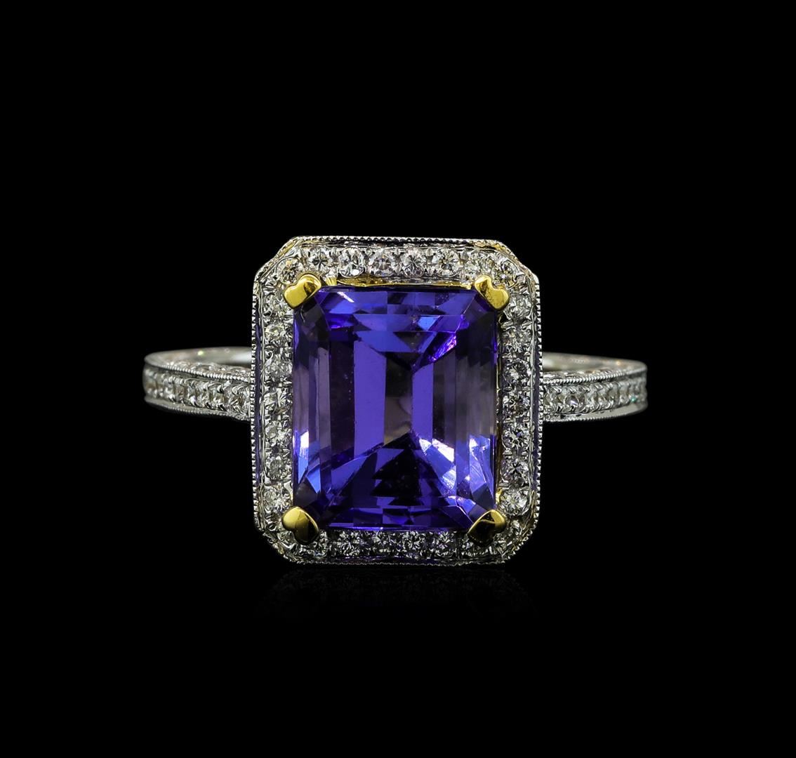 One electronically tested 18KT white and yellow gold lady's combination cast & assembled fashion ring with a cathedral shank with a bright polish with milgrain detailing finish. The featured lady's ring has a shank measuring 1.80 millimeters wide. Identified with markings of '18K'. Condition is new, good workmanship. Containing: One prong set emerald standard step cut natural tanzanite, measuring 9.86 x 8.20 x 6.20mm, (depth est.) 5%. bulge factor, approximate weight of 4.76ct., clarity is eye clean, medium light, moderately strong, bluish violet color, (GIA bV 4/4), cut is good. Transmitting light with no distortion, transparent. Colored gemstones are presumed to have been subjected to commonly used enhancement processes. Graded in the setting. Thirty-Eight prong set round brilliant cut diamonds, measuring 1.50 - 1.30 x 0.87mm (depth est.) approximate total weight of 38 Stones = 0.40ct. Graded in the setting. Clarity SI-1 to I-1. Color: G - H Cut Good One Hundred Ninety-Six prong set round brilliant cut diamonds, measuring 1.10 - 1.00 x 0.65mm (depth est.) approximate total weight of 196 Stones = 0.86ct. Graded in the setting. Clarity SI-1 to I-1. Color: G - H Cut Good. Total Weight of Colored Stones 4.76ct.. Total Weight of Diamonds 1.26ct.. Total Weight of Ring 7.70gm GAS Appraised at $9,145.00.
