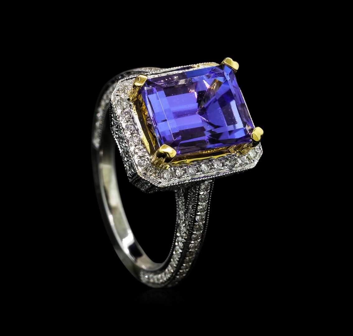 One electronically tested 18KT white and yellow gold lady's combination cast & assembled fashion ring with a cathedral shank with a bright polish with milgrain detailing finish. The featured lady's ring has a shank measuring 1.80 millimeters wide. Identified with markings of '18K'. Condition is new, good workmanship. Containing: One prong set emerald standard step cut natural tanzanite, measuring 9.86 x 8.20 x 6.20mm, (depth est.) 5%. bulge factor, approximate weight of 4.76ct., clarity is eye clean, medium light, moderately strong, bluish violet color, (GIA bV 4/4), cut is good. Transmitting light with no distortion, transparent. Colored gemstones are presumed to have been subjected to commonly used enhancement processes. Graded in the setting. Thirty-Eight prong set round brilliant cut diamonds, measuring 1.50 - 1.30 x 0.87mm (depth est.) approximate total weight of 38 Stones = 0.40ct. Graded in the setting. Clarity SI-1 to I-1. Color: G - H Cut Good One Hundred Ninety-Six prong set round brilliant cut diamonds, measuring 1.10 - 1.00 x 0.65mm (depth est.) approximate total weight of 196 Stones = 0.86ct. Graded in the setting. Clarity SI-1 to I-1. Color: G - H Cut Good. Total Weight of Colored Stones 4.76ct.. Total Weight of Diamonds 1.26ct.. Total Weight of Ring 7.70gm GAS Appraised at $9,145.00.