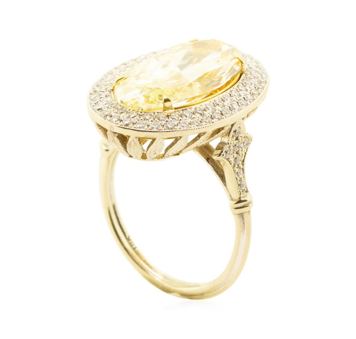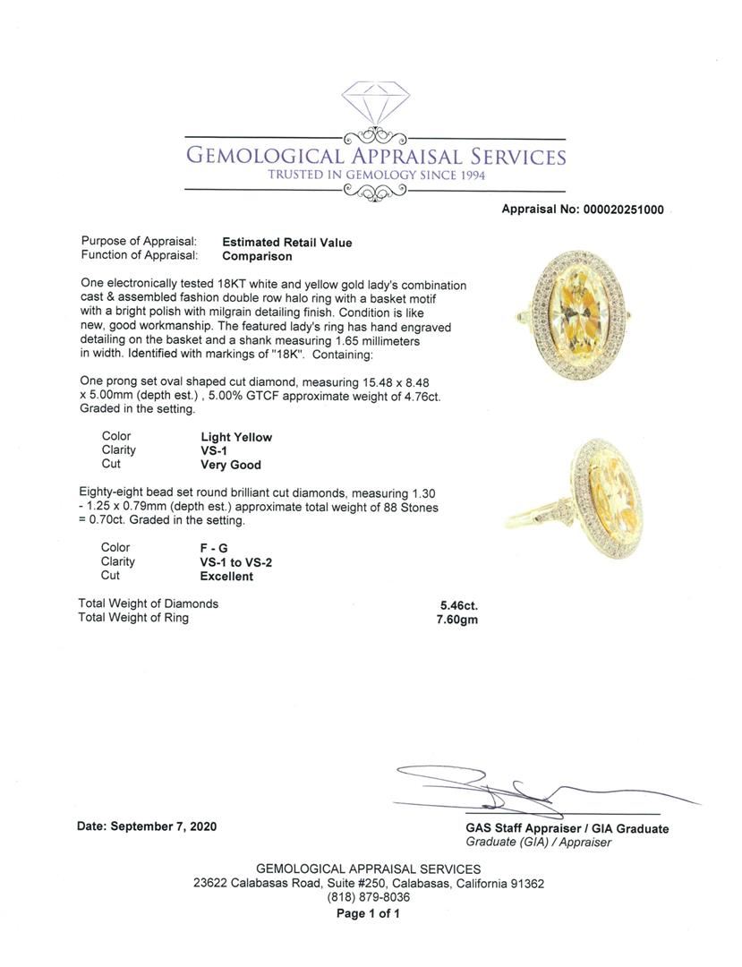 One electronically tested 18KT white and yellow gold lady's combination cast & assembled fashion double row halo ring with a basket motif with a bright polish with milgrain detailing finish. Condition is like new, good workmanship. The featured lady's ring has hand engraved detailing on the basket and a shank measuring 1.65 millimeters in width. Identified with markings of "18K". Containing: One prong set oval shaped cut diamond, measuring 15.48 x 8.48 x 5.00mm (depth est.) , 5.00% GTCF approximate weight of 4.76ct. Graded in the setting. Color Light Yellow Clarity VS-1 Cut Very Good. Eighty-eight bead set round brilliant cut diamonds, measuring 1.30 - 1.25 x 0.79mm (depth est.) approximate total weight of 88 Stones = 0.70ct. Graded in the setting. Color F - G Clarity VS-1 to VS-2 Cut Excellent. Total Weight of Diamonds 5.46ct. Total Weight of Ring 7.60gm. Appraisal No: 00020251000