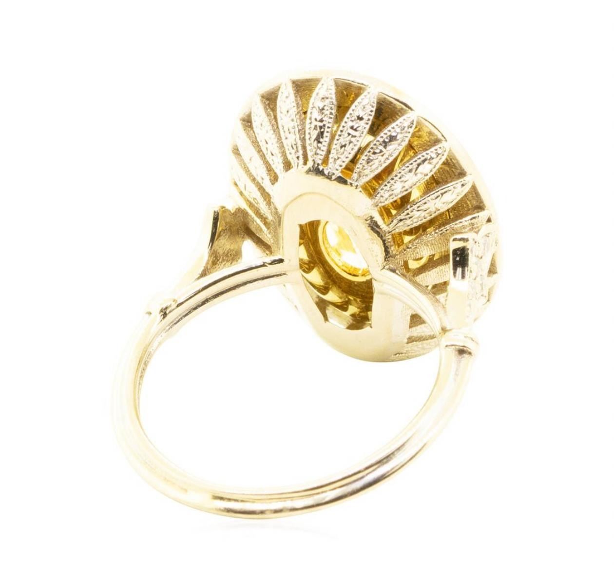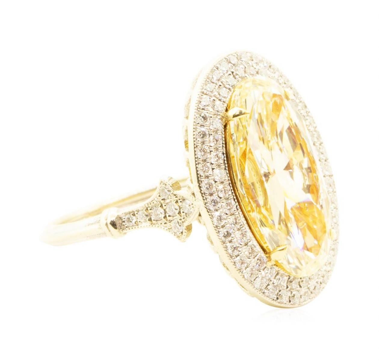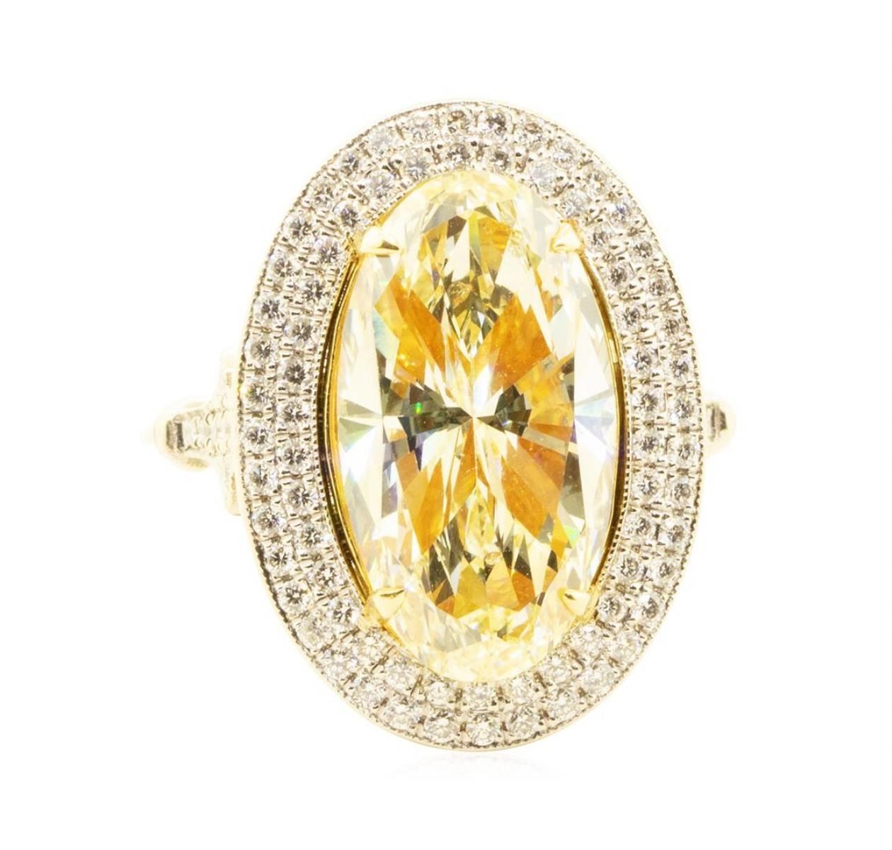 One electronically tested 18KT white and yellow gold lady's combination cast & assembled fashion double row halo ring with a basket motif with a bright polish with milgrain detailing finish. Condition is like new, good workmanship. The featured lady's ring has hand engraved detailing on the basket and a shank measuring 1.65 millimeters in width. Identified with markings of "18K". Containing: One prong set oval shaped cut diamond, measuring 15.48 x 8.48 x 5.00mm (depth est.) , 5.00% GTCF approximate weight of 4.76ct. Graded in the setting. Color Light Yellow Clarity VS-1 Cut Very Good. Eighty-eight bead set round brilliant cut diamonds, measuring 1.30 - 1.25 x 0.79mm (depth est.) approximate total weight of 88 Stones = 0.70ct. Graded in the setting. Color F - G Clarity VS-1 to VS-2 Cut Excellent. Total Weight of Diamonds 5.46ct. Total Weight of Ring 7.60gm. Appraisal No: 00020251000