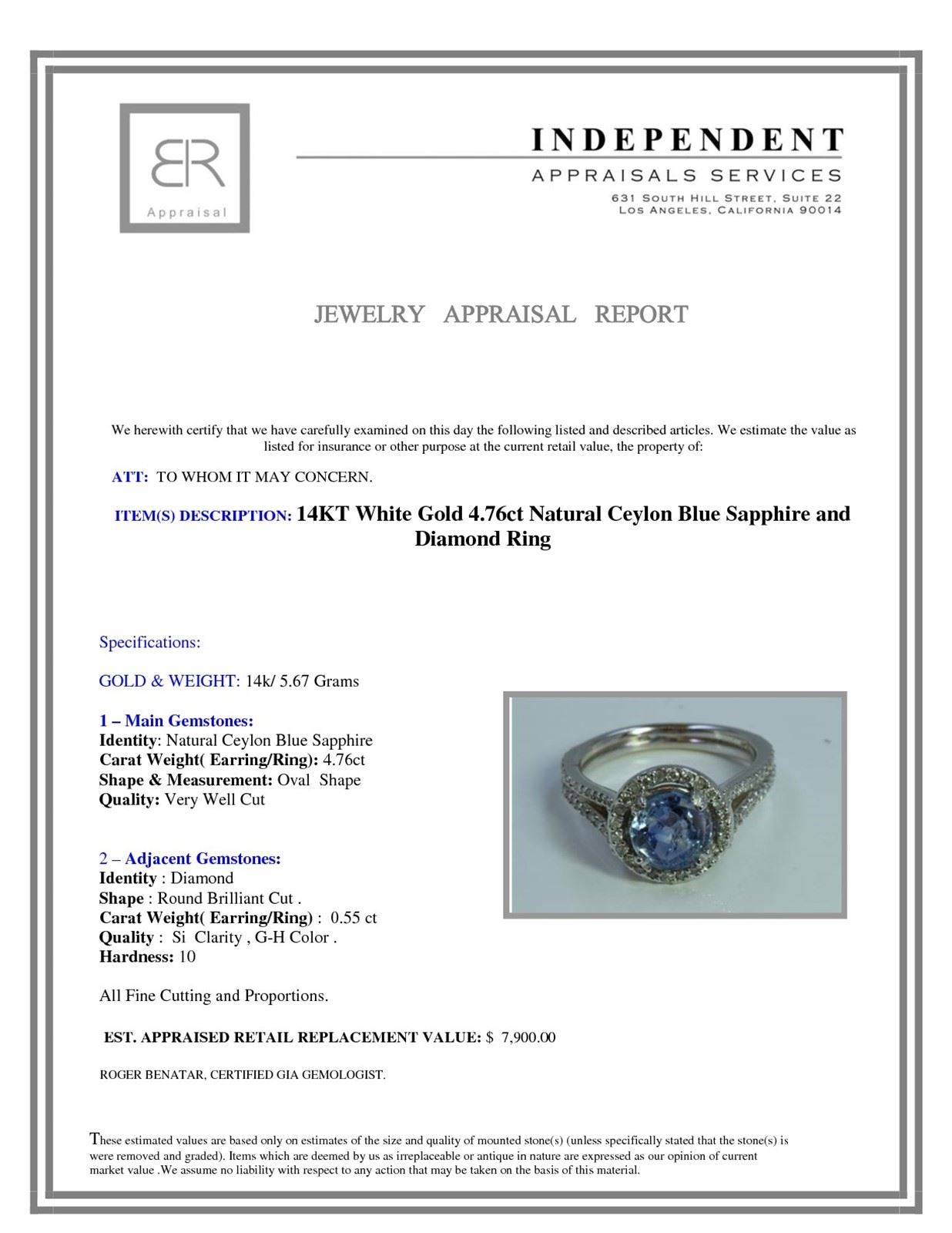 14K W/G NATURAL CEYLON BLUE SAPPHIRE RING :5.67GRAM /NATURAL CEYLON BLUE SAPPHIRE :4.76CT/DIAMOND:0.55CT/#GVR1357