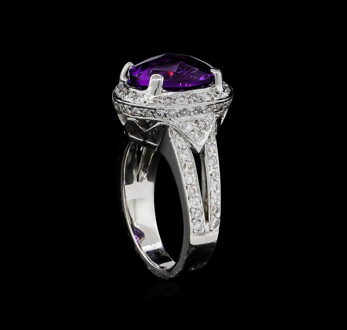 One electronically tested 14KT white gold ladies cast amethyst and diamond ring. The featured amethyst is set within a diamond bezel supported by a lattice under gallery and diamond set split shoulders, completed by a three and one-half millimeter wide band. Bright polish finish with milgrain detailing. Identified with markings of "14K". Condition is good. Containing: One prong set oval mixed cut natural amethyst, measuring 11.85 x 10.00 x 6.65mm, 6%. bulge factor, approximate weight of 4.77ct., clarity is eye clean, type II, medium dark, very slightly grayish, purple color, (GIA P 6/3), cut is good. Transmitting light with no distortion, transparent. Graded in the setting. Fifty prong set round brilliant cut diamonds, measuring 1.70 - 1.60 x 0.99mm (depth est.) approximate total weight of 50 Stones = 0.92ct. Graded in the setting. Clarity: SI-1 to I-1. Color: G - I Thirty-Six prong set round brilliant cut diamonds, measuring 1.50 - 1.30 x 0.84mm (depth est.) approximate total weight of 36 Stones = 0.46ct. Graded in the setting. Clarity: SI-1 to I-1. Color: G - I. Total Weight of Colored Stones 4.77ct. Total Weight of Diamonds 1.38ct. Total Weight of Ring 12.81gm. AIG Appraised at $6,120.00.