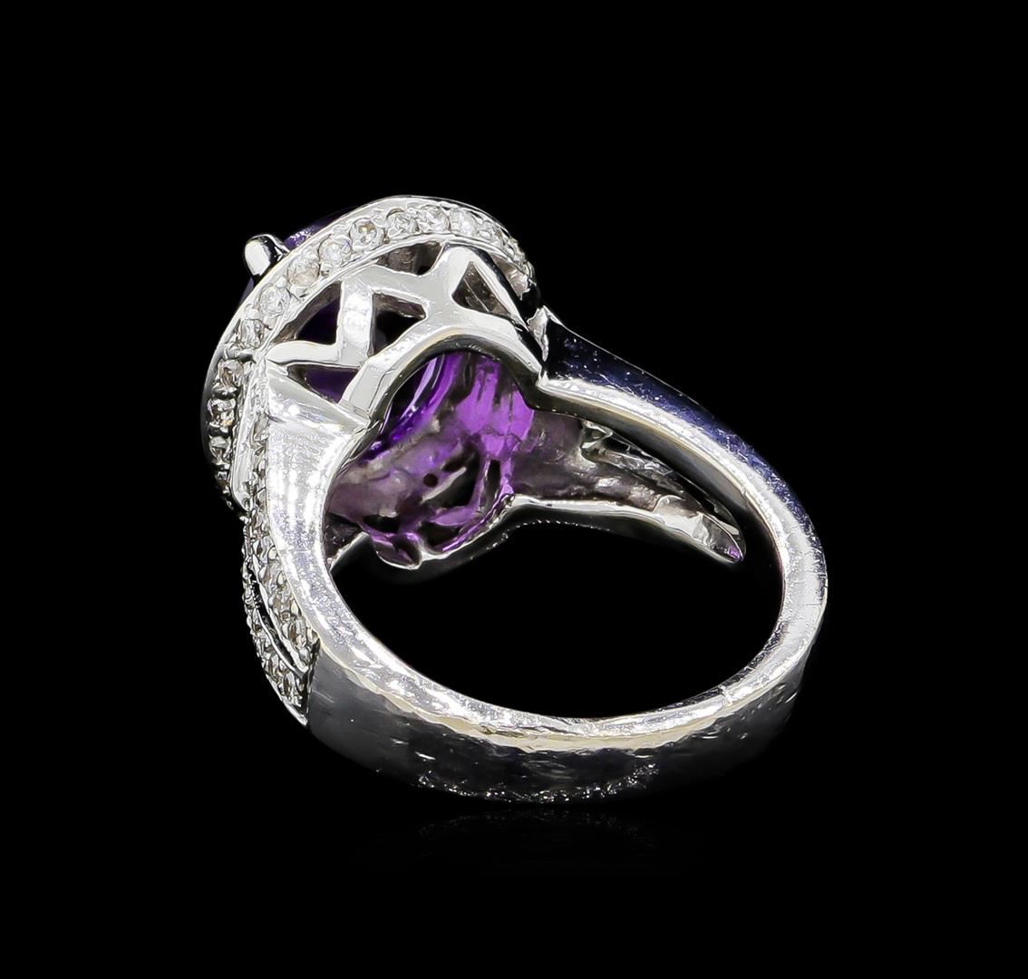 One electronically tested 14KT white gold ladies cast amethyst and diamond ring. The featured amethyst is set within a diamond bezel supported by a lattice under gallery and diamond set split shoulders, completed by a three and one-half millimeter wide band. Bright polish finish with milgrain detailing. Identified with markings of "14K". Condition is good. Containing: One prong set oval mixed cut natural amethyst, measuring 11.85 x 10.00 x 6.65mm, 6%. bulge factor, approximate weight of 4.77ct., clarity is eye clean, type II, medium dark, very slightly grayish, purple color, (GIA P 6/3), cut is good. Transmitting light with no distortion, transparent. Graded in the setting. Fifty prong set round brilliant cut diamonds, measuring 1.70 - 1.60 x 0.99mm (depth est.) approximate total weight of 50 Stones = 0.92ct. Graded in the setting. Clarity: SI-1 to I-1. Color: G - I Thirty-Six prong set round brilliant cut diamonds, measuring 1.50 - 1.30 x 0.84mm (depth est.) approximate total weight of 36 Stones = 0.46ct. Graded in the setting. Clarity: SI-1 to I-1. Color: G - I. Total Weight of Colored Stones 4.77ct. Total Weight of Diamonds 1.38ct. Total Weight of Ring 12.81gm. AIG Appraised at $6,120.00.