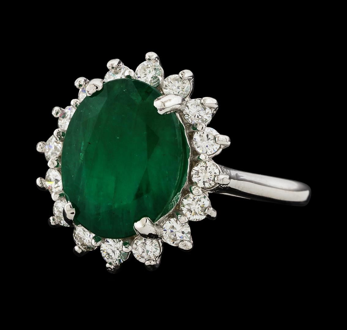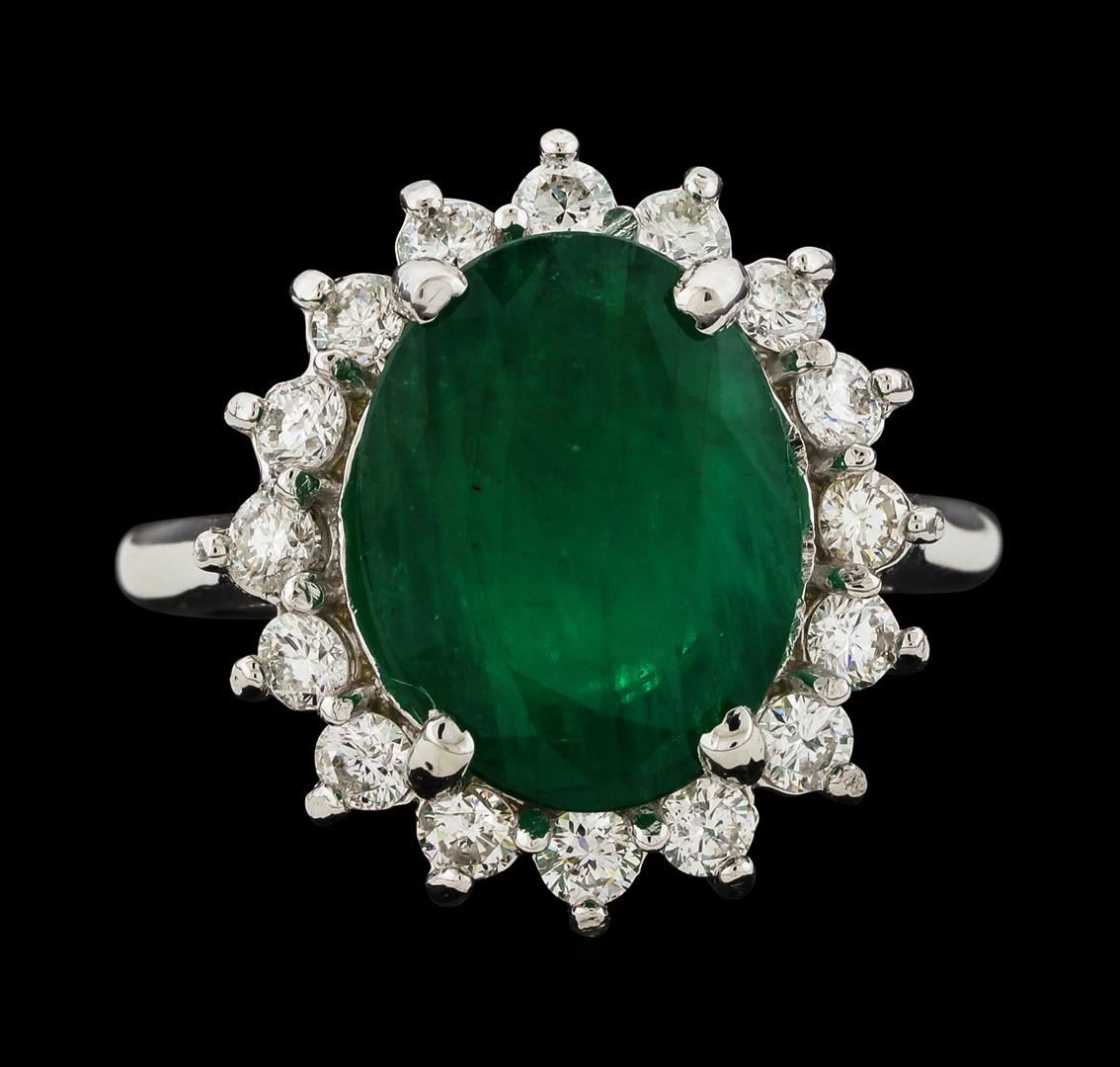 One electronically tested 14KT white gold lady's cast fashion ring with a basket halo with a bright polish finish. The featured lady's ring has a shank measuring 2.10 millimeters wide. Identified with markings of '14K'. Condition is new, good workmanship. Containing: One prong set oval modified mixed cut natural emerald, measuring 13.27 x 10.17 x 6.19mm, (depth est.) approximate weight of 4.77ct., clarity is heavily included, medium dark, moderately strong, green color, (GIA G 6/4), cut is good. Transmitting light somewhat diffusely, semi-transparent to translucent. Naturally occurring internal & external characteristics are present. Indications of oil residue. Colored gemstones are presumed to have been subjected to commonly used enhancement processes. Graded in the setting. Sixteen prong set round brilliant cut diamonds, measuring 2.40 - 2.35 x 1.45mm (depth est.) approximate total weight of 16 Stones = 0.80ct. Graded in the setting. Clarity VS-2 to SI-2. Color: G - H Cut Good. Total Weight of Colored Stones 4.77ct.. Total Weight of Diamonds 0.80ct.. Total Weight of Ring 6.50gm GAS Appraised at $6,820.00.