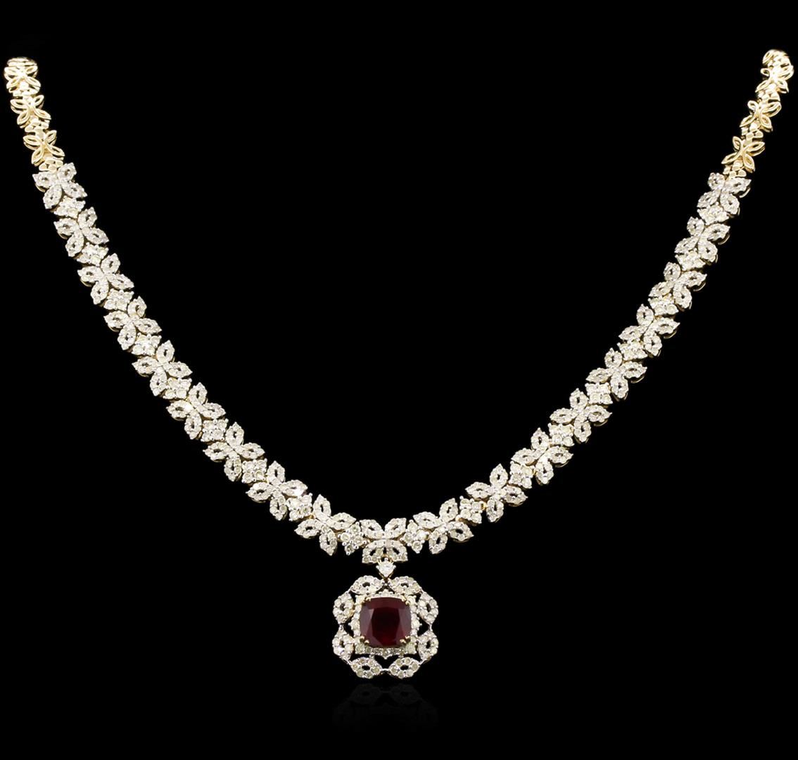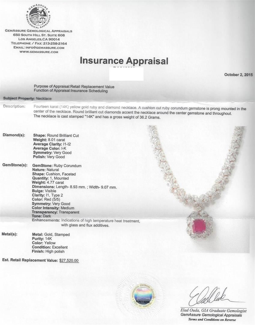 Fourteen karat (14K) yellow gold ruby and diamond necklace. A cushion cut ruby corundum gemstone is prong mounted in the center of the necklace. Round brilliant cut diamonds accent the necklace around the center gemstone and throughout. The necklace is cast stamped "14K" and has a gross weight of 36.2 Grams. Diamond(s): Shape: Round Brilliant Cut. Weight: 8.01 carat. Average Clarity: I1-I2. Average Color: I-K. Symmetry: Very Good. Polish: Very Good. GemStone(s): GemStone: Ruby Corundum. Nature: Natural. Shape: Cushion, Faceted. Weight: 4.77 carat. Center Gemstone Dimensions: Length- 8.93 mm. ; Width- 9.07 mm. Bulge: Visible. Clarity: I1, Type 2. Color: Red (5/5). Symmetry: Very Good. Color Intensity: Medium. Transparency: Transparent. Tone: Dark. Enhancements: Indications of high temperature heat treatment, with glass and flux additives. Metal(s): Metal: Gold, Stamped. Purity: 14K. Color: Yellow. Condition: Excellent. Finish: High polish. GGA Appraised.