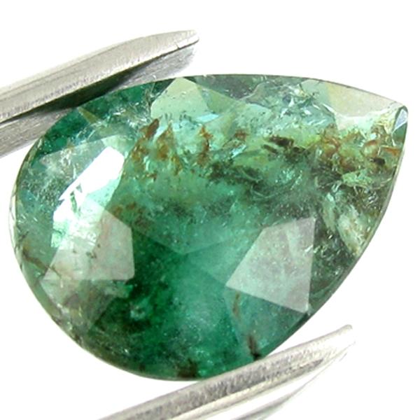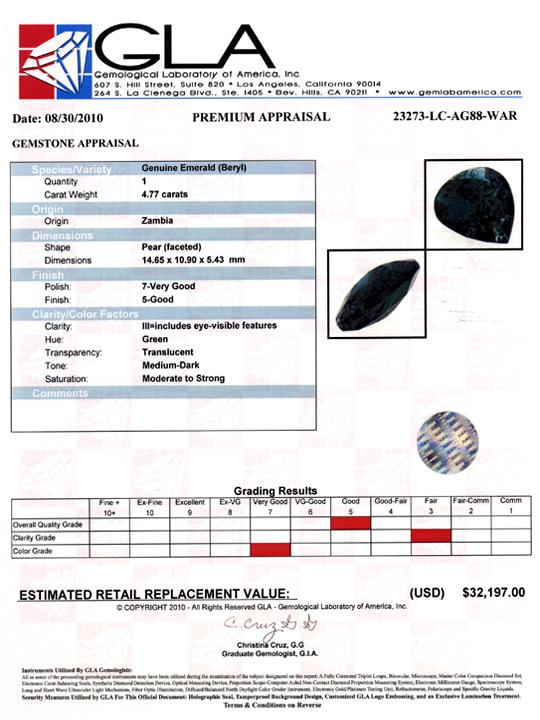 Excellent green colored specimen pear cut; lab quality evaluation 5; treatment as noted; Gem Guide wholesale $4770-$7155; full retail appraisal $32197; full lab evaluation included