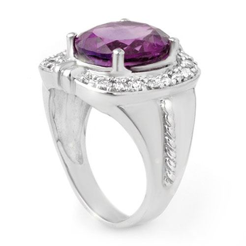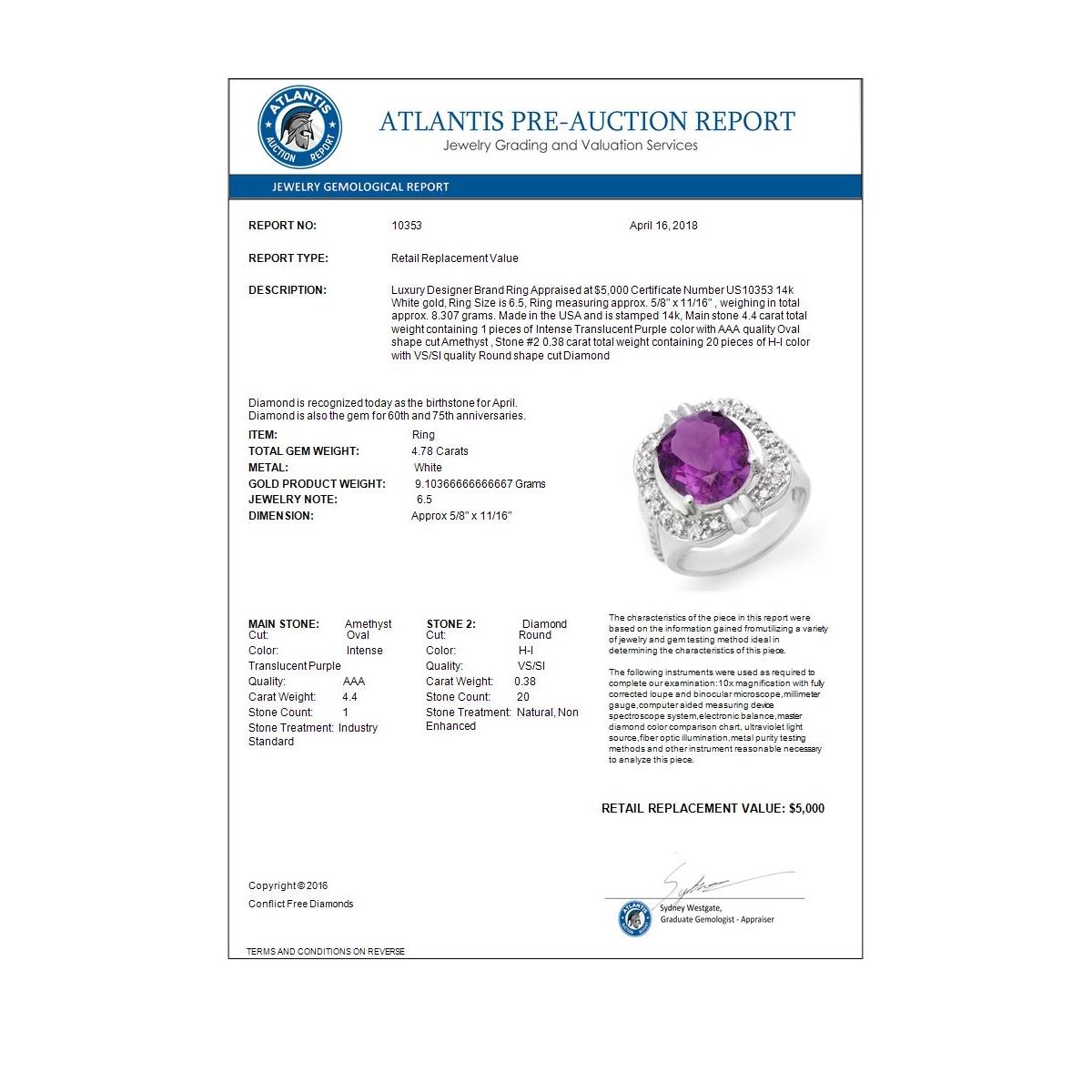 REF-70A2X -10353 ---- 4.78 CTW Amethyst & Diamond Ring 14K White Gold ---- Luxury Designer Brand Ring Appraised at $5,000 Certificate Number US10353 14k White gold, Ring Size is 6.5, Ring measuring approx. 5/8" x 11/16" , weighing in total approx. 8.307 grams. Made in the USA and is stamped 14k, Main stone 4.4 carat total weight containing 1 pieces of Intense Translucent Purple color with AAA quality Oval shape cut Amethyst , Stone #2 0.38 carat total weight containing 20 pieces of H-I color with VS/SI quality Round shape cut Diamond