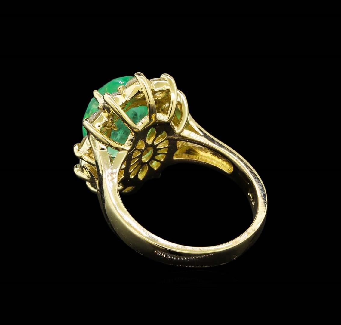 One electronically tested 14KT yellow gold lady's cast fashion ring with a split shank basket halo with a bright polish finish. The featured lady's ring has a shank measuring 2.77 millimeters wide. Identified with markings of '14K'. Condition is new, good workmanship. Containing: One prong set oval modified brilliant cut natural emerald, measuring 11.68 x 8.54 x 7.90mm, (depth est.) 5%. bulge factor, approximate weight of 4.78ct., clarity is heavily included, medium light, moderately strong, green color, (GIA G 4/4), cut is good. Transmitting light somewhat diffusely, semi-transparent to translucent. Naturally occurring internal & external characteristics are present. Indications of oil residue. Colored gemstones are presumed to have been subjected to commonly used enhancement processes. Graded in the setting. Twelve prong set round brilliant cut diamonds, measuring 3.20 - 3.10 x 1.92mm (depth est.) approximate total weight of 12 Stones = 1.40ct. Graded in the setting. Clarity VS-2 to SI-2. Color: H - I Cut Very Good. Total Weight of Colored Stones 4.78ct.. Total Weight of Diamonds 1.40ct.. Total Weight of Ring 7.80gm. GAS Appraised at $11,070.00.