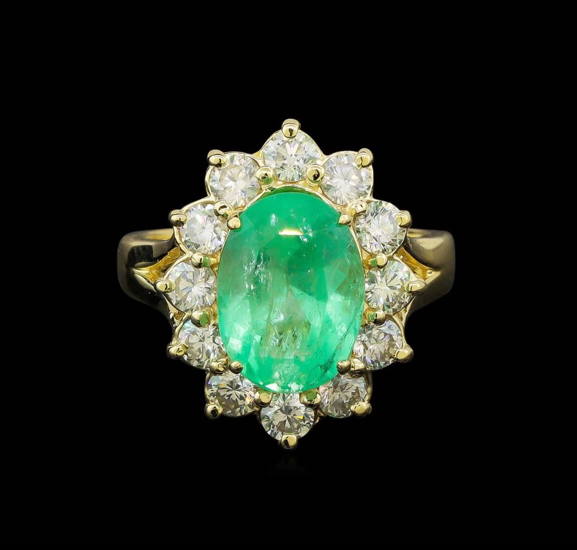One electronically tested 14KT yellow gold lady's cast fashion ring with a split shank basket halo with a bright polish finish. The featured lady's ring has a shank measuring 2.77 millimeters wide. Identified with markings of '14K'. Condition is new, good workmanship. Containing: One prong set oval modified brilliant cut natural emerald, measuring 11.68 x 8.54 x 7.90mm, (depth est.) 5%. bulge factor, approximate weight of 4.78ct., clarity is heavily included, medium light, moderately strong, green color, (GIA G 4/4), cut is good. Transmitting light somewhat diffusely, semi-transparent to translucent. Naturally occurring internal & external characteristics are present. Indications of oil residue. Colored gemstones are presumed to have been subjected to commonly used enhancement processes. Graded in the setting. Twelve prong set round brilliant cut diamonds, measuring 3.20 - 3.10 x 1.92mm (depth est.) approximate total weight of 12 Stones = 1.40ct. Graded in the setting. Clarity VS-2 to SI-2. Color: H - I Cut Very Good. Total Weight of Colored Stones 4.78ct.. Total Weight of Diamonds 1.40ct.. Total Weight of Ring 7.80gm. GAS Appraised at $11,070.00.