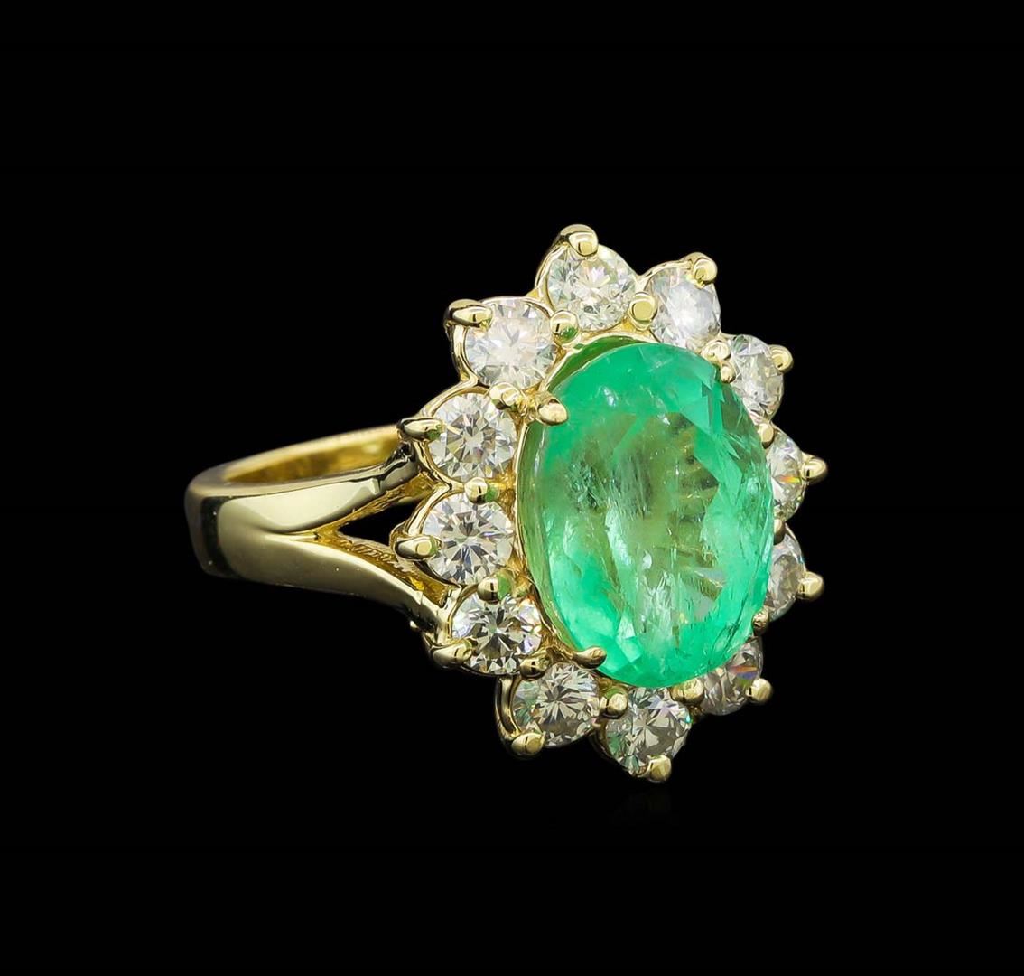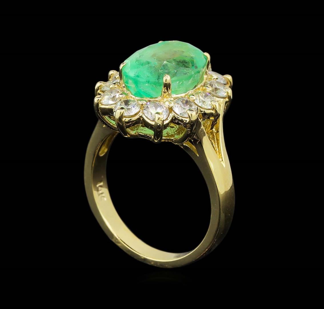 One electronically tested 14KT yellow gold lady's cast fashion ring with a split shank basket halo with a bright polish finish. The featured lady's ring has a shank measuring 2.77 millimeters wide. Identified with markings of '14K'. Condition is new, good workmanship. Containing: One prong set oval modified brilliant cut natural emerald, measuring 11.68 x 8.54 x 7.90mm, (depth est.) 5%. bulge factor, approximate weight of 4.78ct., clarity is heavily included, medium light, moderately strong, green color, (GIA G 4/4), cut is good. Transmitting light somewhat diffusely, semi-transparent to translucent. Naturally occurring internal & external characteristics are present. Indications of oil residue. Colored gemstones are presumed to have been subjected to commonly used enhancement processes. Graded in the setting. Twelve prong set round brilliant cut diamonds, measuring 3.20 - 3.10 x 1.92mm (depth est.) approximate total weight of 12 Stones = 1.40ct. Graded in the setting. Clarity VS-2 to SI-2. Color: H - I Cut Very Good. Total Weight of Colored Stones 4.78ct.. Total Weight of Diamonds 1.40ct.. Total Weight of Ring 7.80gm. GAS Appraised at $11,070.00.