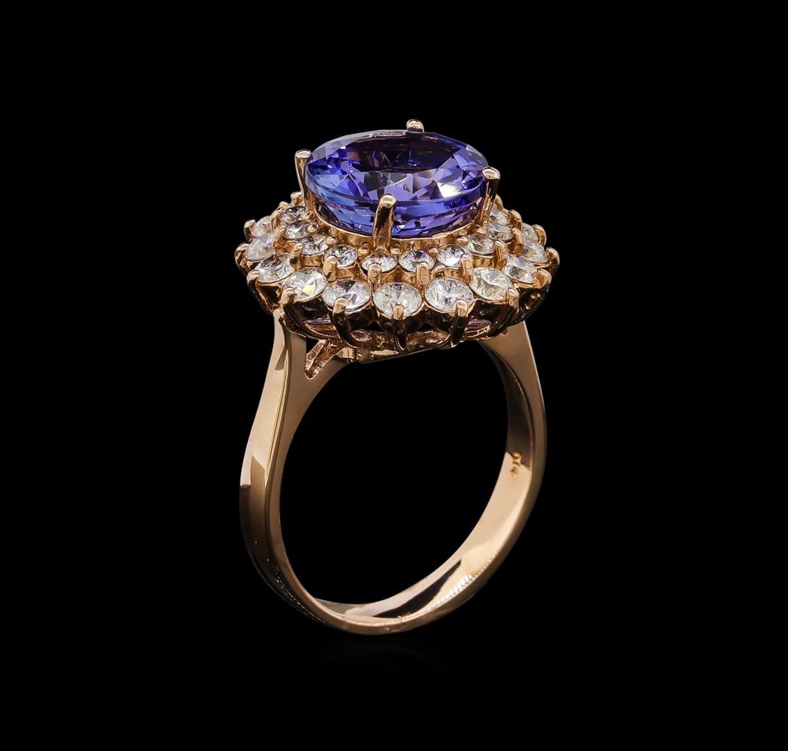 One electronically tested 14KT rose gold lady's cast fashion ring with a double basket halo with a bright polish finish. The featured lady's ring has a shank measuring 3.05 Identified with markings of 'K14'. Condition is new, good workmanship. Containing: One prong set round modified brilliant cut natural tanzanite, measuring 10.54 - 10.45 x 6.60 mm, (depth est.) approximate weight of 4.78ct., clarity is eye clean, medium, moderately strong, bluish violet color, (GIA bV 5/4), cut is very good. Transmitting light with no distortion, transparent. Colored gemstones are presumed to have been subjected to commonly used enhancement processes. Graded in the setting. Sixteen prong set round brilliant cut diamonds, measuring 2.80 - 2.70 x 1.71mm (depth est.) approximate total weight of 16 Stones = 1.28ct. Graded in the setting. Clarity SI-1 to I-1. Color: H - I Cut Good Sixteen prong set round brilliant cut diamonds, measuring 2.10 - 2.00 x 1.25mm (depth est.) approximate total weight of 16 Stones = 0.51ct. Graded in the setting. Clarity SI-1 to SI-2. Color: H - I Cut Good. Total Weight of Colored Stones 4.78ct.. Total Weight of Diamonds 1.79ct.. Total Weight of Ring 8.00gm GAS Appraised at $12,365.00.
