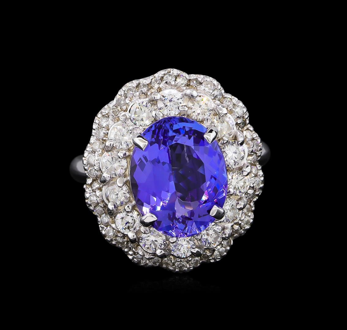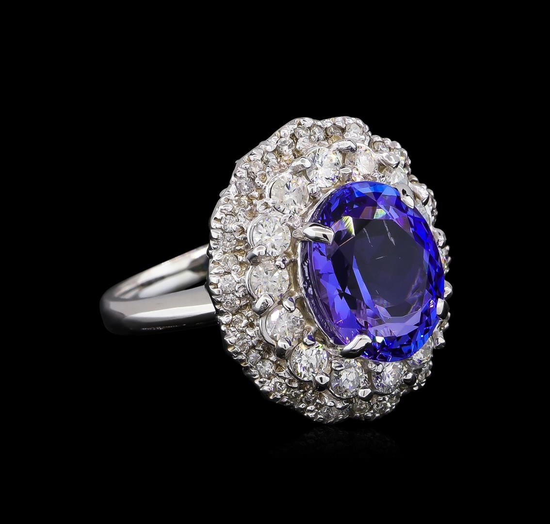 One electronically tested 14KT white gold lady's cast fashion ring with a scalloped double basket halo with a bright polish finish. The featured lady's ring has a shank measuring 2.42 millimeters wide. Identified with markings of "K14". Condition is new, good workmanship. Containing: One prong set oval modified brilliant cut natural tanzanite, measuring 11.87 x 9.45 x 5.84mm, 3%. bulge factor, approximate weight of 4.78ct., clarity is eye clean, type I, medium, moderately strong, bluish violet color, (GIA bV 5/4), cut is good. Transmitting light with no distortion, transparent. Colored gemstones are presumed to have been subjected to commonly used enhancement processes. Graded in the setting. Fourteen prong set round brilliant cut diamonds, measuring 2.60 - 2.50 x 1.56mm (depth est.) approximate total weight of 14 Stones = 0.86ct. Graded in the setting. Clarity: SI-1 to I-1. Color: H - I. Cut Good Forty-Two prong set round brilliant cut diamonds, measuring 1.30 - 1.20 x 0.75mm (depth est.) approximate total weight of 42 Stones = 0.30ct. Graded in the setting. Clarity: SI-1 to I-1. Color: H - I. Cut Good. Total Weight of Colored Stones 4.78ct. Total Weight of Diamonds 1.16ct. Total Weight of Ring 8.50gm. GAS Appraised at $11,220.00.