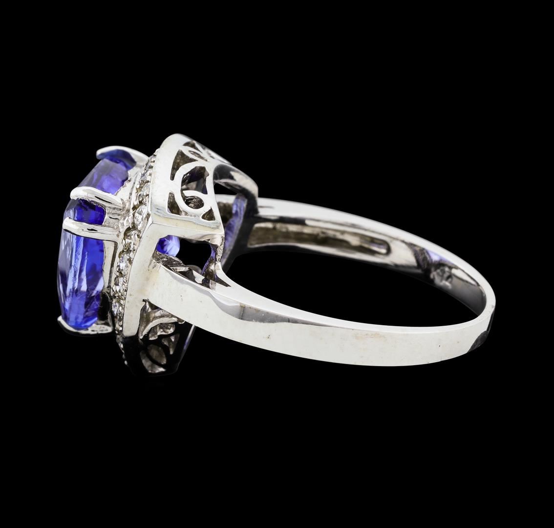One electronically tested 14KT white gold lady's cast fashion ring with a cathedral halo with a bright polish finish. The featured lady's ring has a shank measuring 1.90 millimeters wide. Identified with markings of 'K14'. Condition is new, good workmanship. Containing: One prong set triangle modified brilliant cut natural tanzanite, measuring 10.74 x 10.50 x 6.89mm, (depth est.) approximate weight of 4.78ct., clarity is eye clean, medium, moderately strong, bluish violet color, (GIA bV 5/4), cut is very good. Transmitting light with no distortion, transparent. Colored gemstones are presumed to have been subjected to commonly used enhancement processes. Graded in the setting. Twenty-Four bead set round brilliant cut diamonds, measuring 1.70 - 1.65 x 1.04mm (depth est.) approximate total weight of 24 Stones = 0.44ct. Graded in the setting. Clarity SI-1 to I-1. Color: H - I Cut Good. Total Weight of Colored Stones 4.78ct.. Total Weight of Diamonds 0.44ct.. Total Weight of Ring 5.30gm. GAS Appraised at $8,960.00.