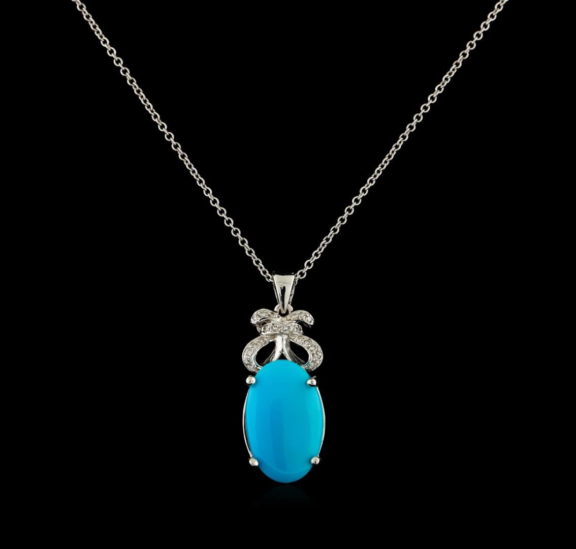 One Pendant With Chain featuring: 14KT White Gold weighing 4.38 grams containing one Turquoise center stone with a total weight of 4.78ct and Diamonds with a total weight of 0.12ct.