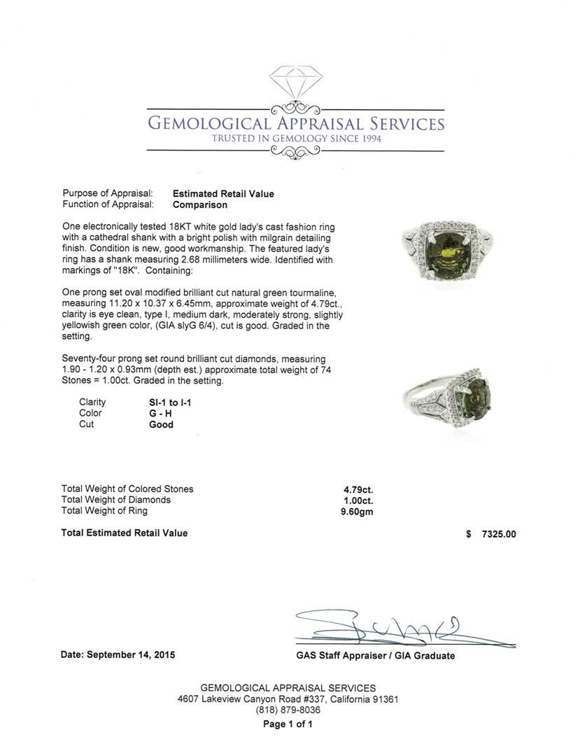 One electronically tested 18KT white gold lady's cast fashion ring with a cathedral shank with a bright polish with milgrain detailing finish. The featured lady's ring has a shank measuring 2.68 millimeters wide. Identified with markings of "18K". Condition is new, good workmanship. Containing: One prong set oval modified brilliant cut natural green tourmaline, measuring 11.20 x 10.37 x 6.45mm, approximate weight of 4.79ct., clarity is eye clean, type I, medium dark, moderately strong, slightly yellowish green color, (GIA slyG 6/4), cut is good. Graded in the setting. Seventy-Four prong set round brilliant cut diamonds, measuring 1.90 - 1.20 x 0.93mm (depth est.) approximate total weight of 74 Stones = 1.00ct. Graded in the setting. Clarity: SI-1 to I-1. Color: G - Good. Total Weight of Colored Stones 4.79ct. Total Weight of Diamonds 1.00ct. Total Weight of Ring 9.60gm. GAS Appraised at $7,325.00.